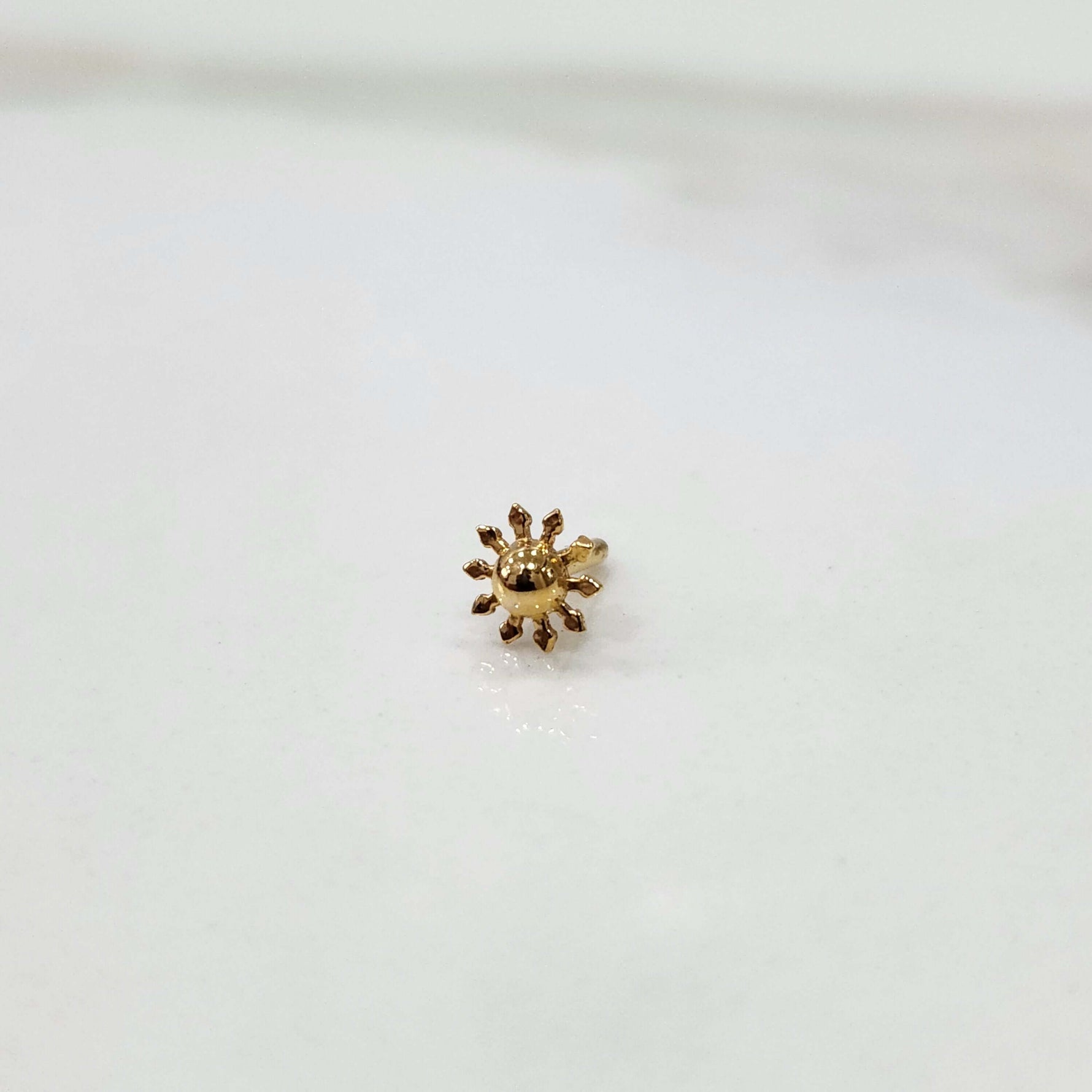 This small nose pin gold has a large central dome that is polished and surrounded by several spokes that are in the form of an arrow and they protrude outwards in a symmetrical manner. The arrows are all contoured and raised a little to give a very dramatic, dimensional look with light reflecting off the arrows in every direction.