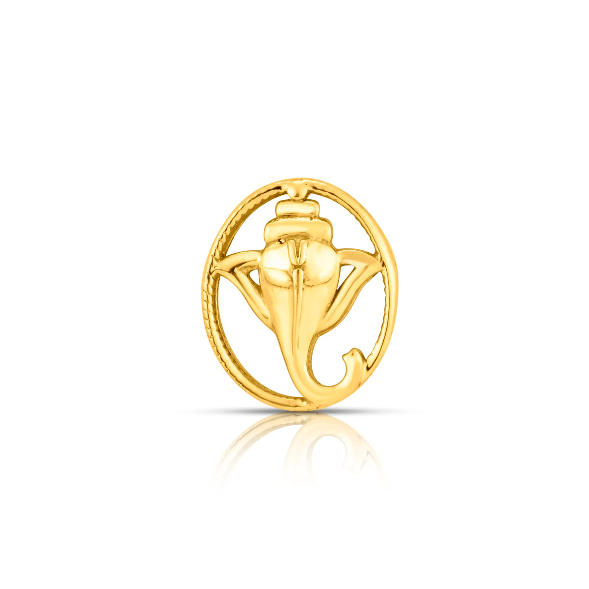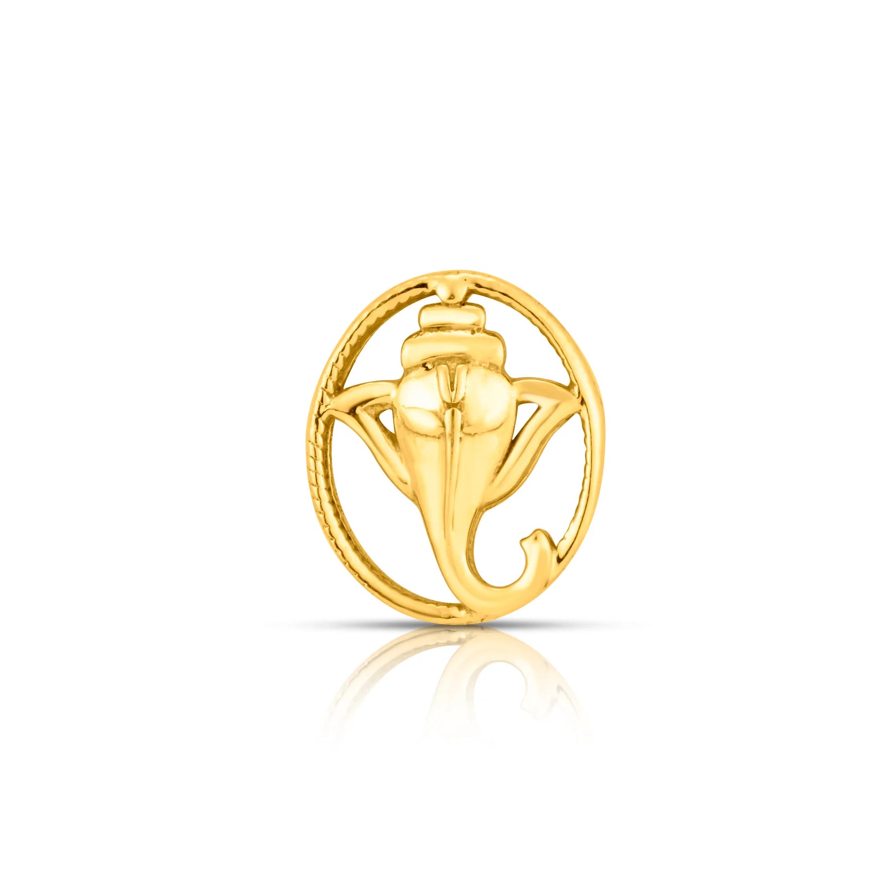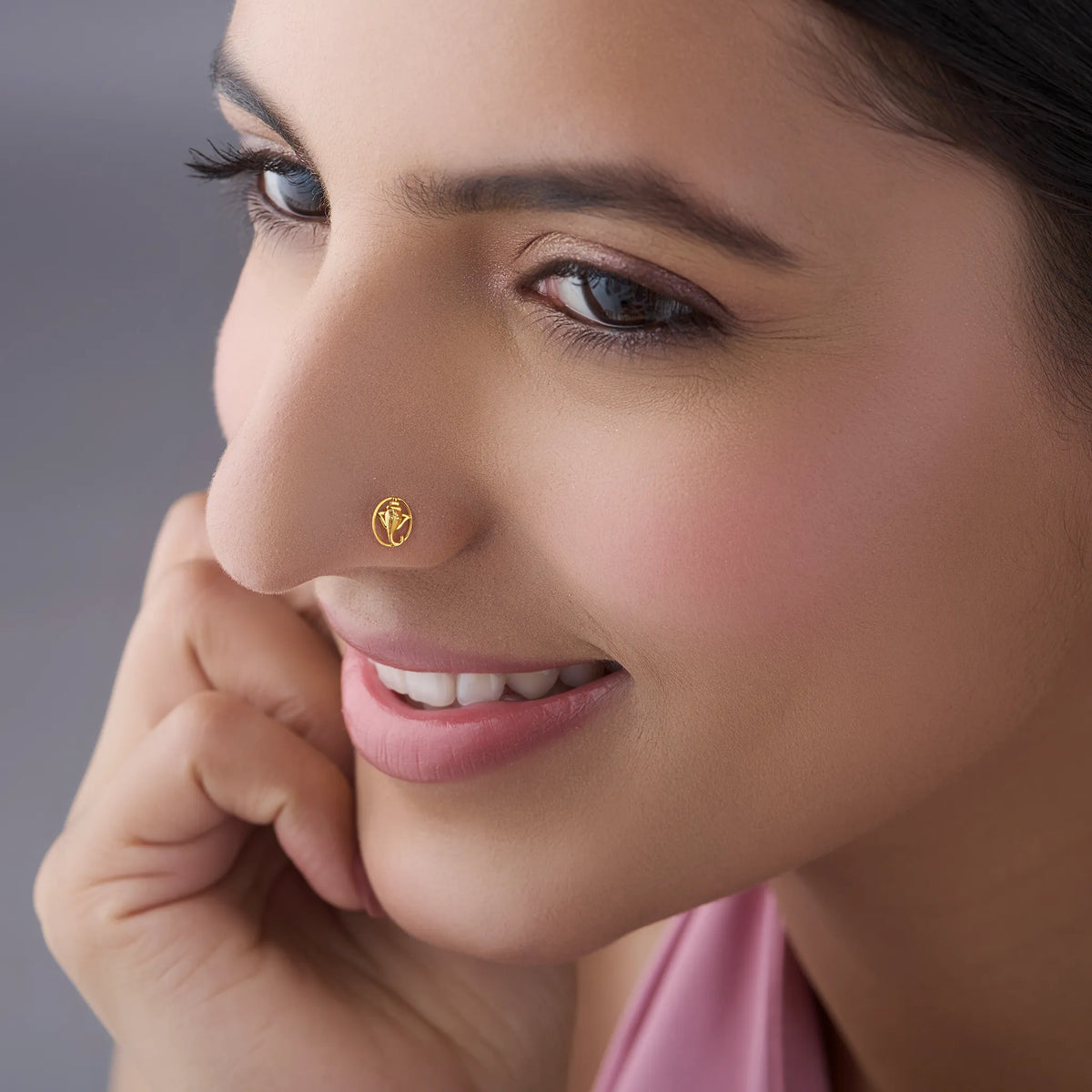 This small nose pin gold has a well carved Ganeshji design, the soft lines of the elephant face and trunk are beautifully enclosed in a round frame. The central figure is very bright and detailed, which emphasizes the iconic attributes of the deity, including the curved trunk and the rich crown.