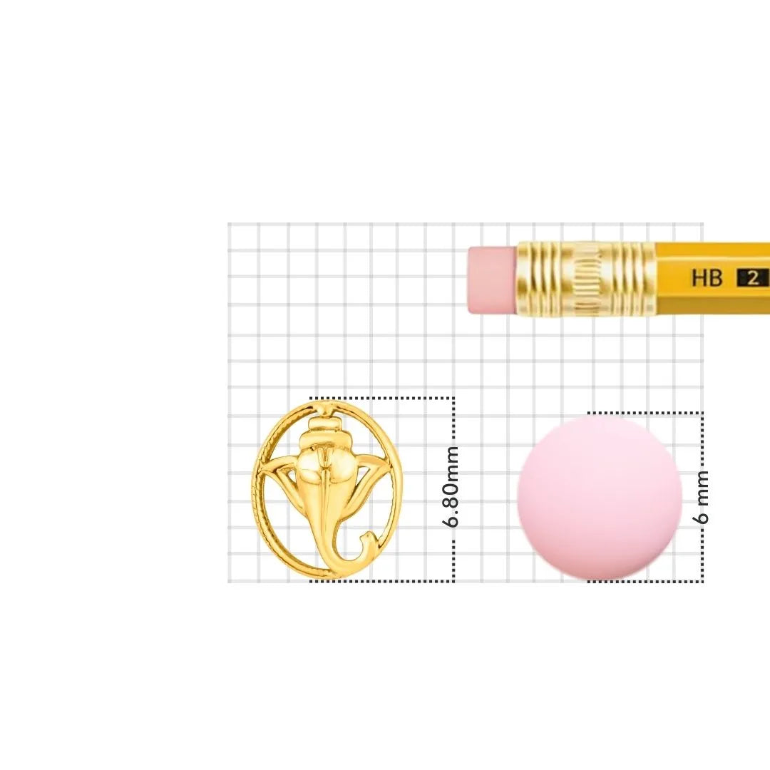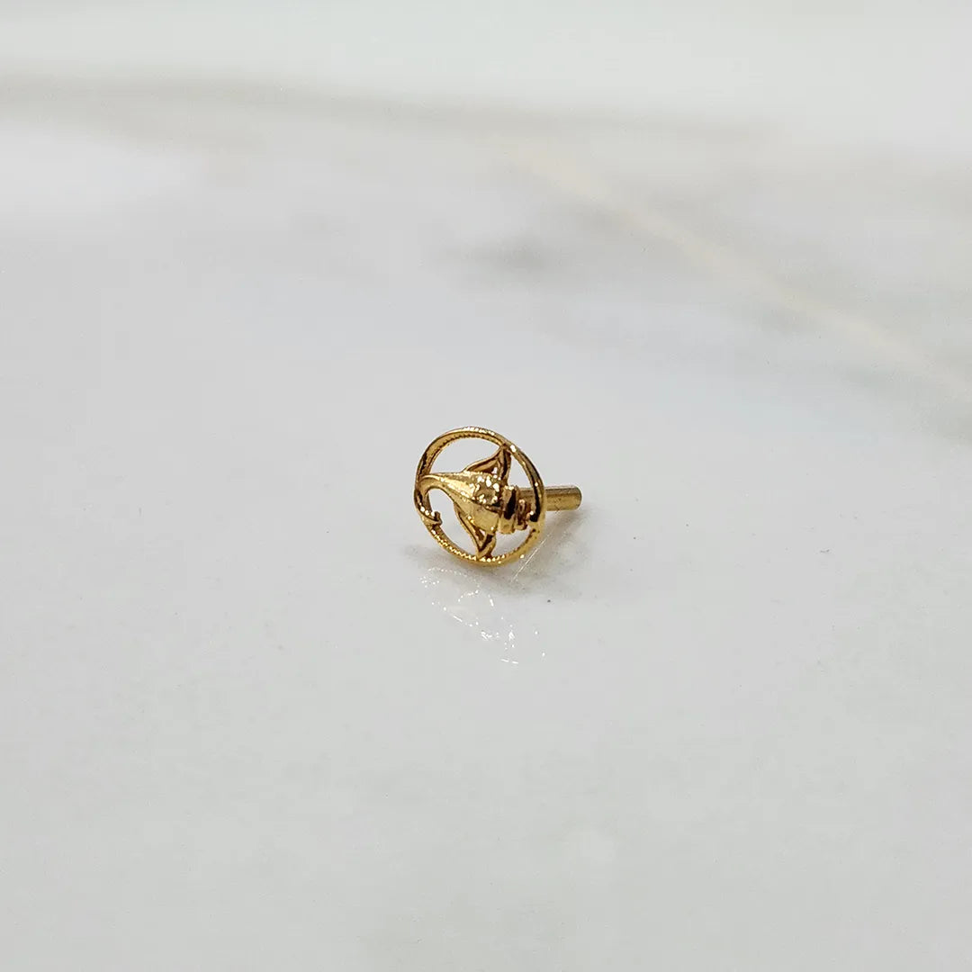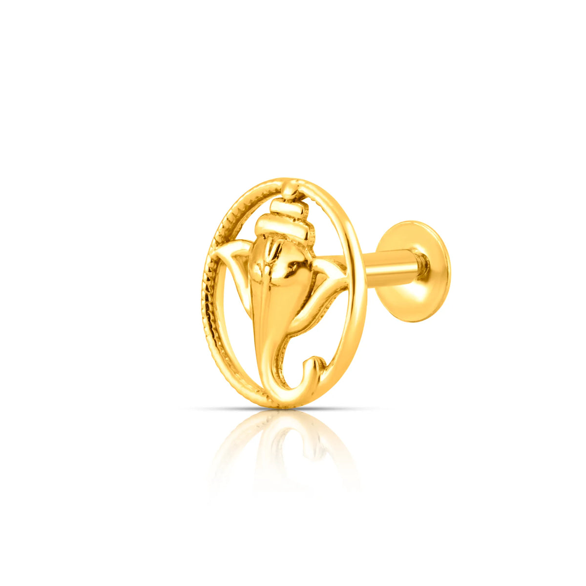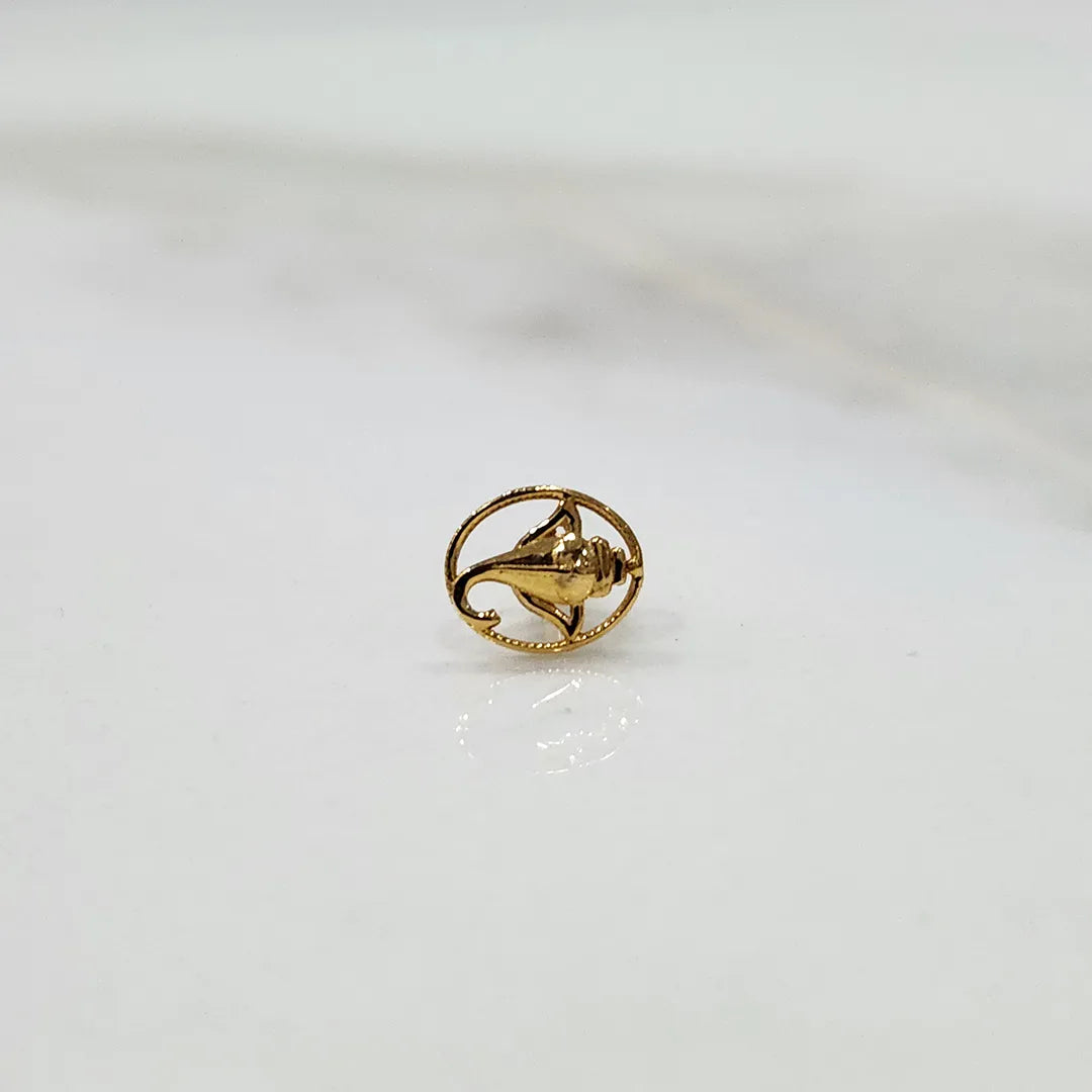 This small nose pin gold has a well carved Ganeshji design, the soft lines of the elephant face and trunk are beautifully enclosed in a round frame. The central figure is very bright and detailed, which emphasizes the iconic attributes of the deity, including the curved trunk and the rich crown.