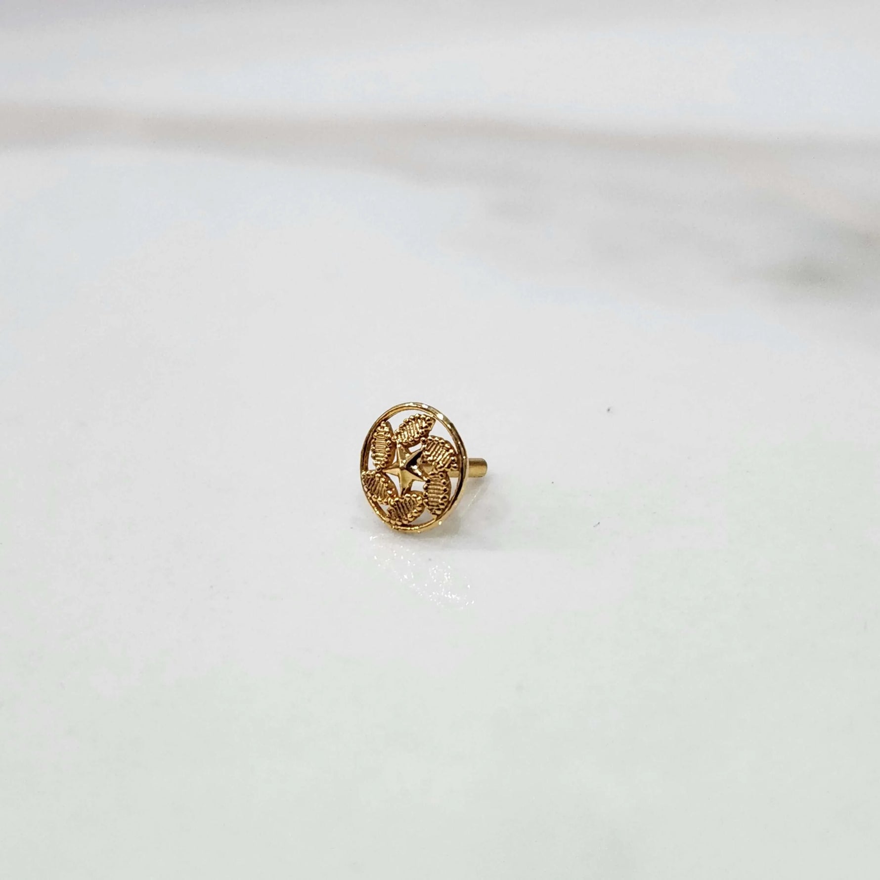 This round gold nose pin without stone has a striking polished star design, which is instantly eye-catching due to the glowing shine. Six leaf elements are finely decorated with the delicate grooves that resemble the veins of real leaves and provide the elements with rich texture and depth and are placed around the star.