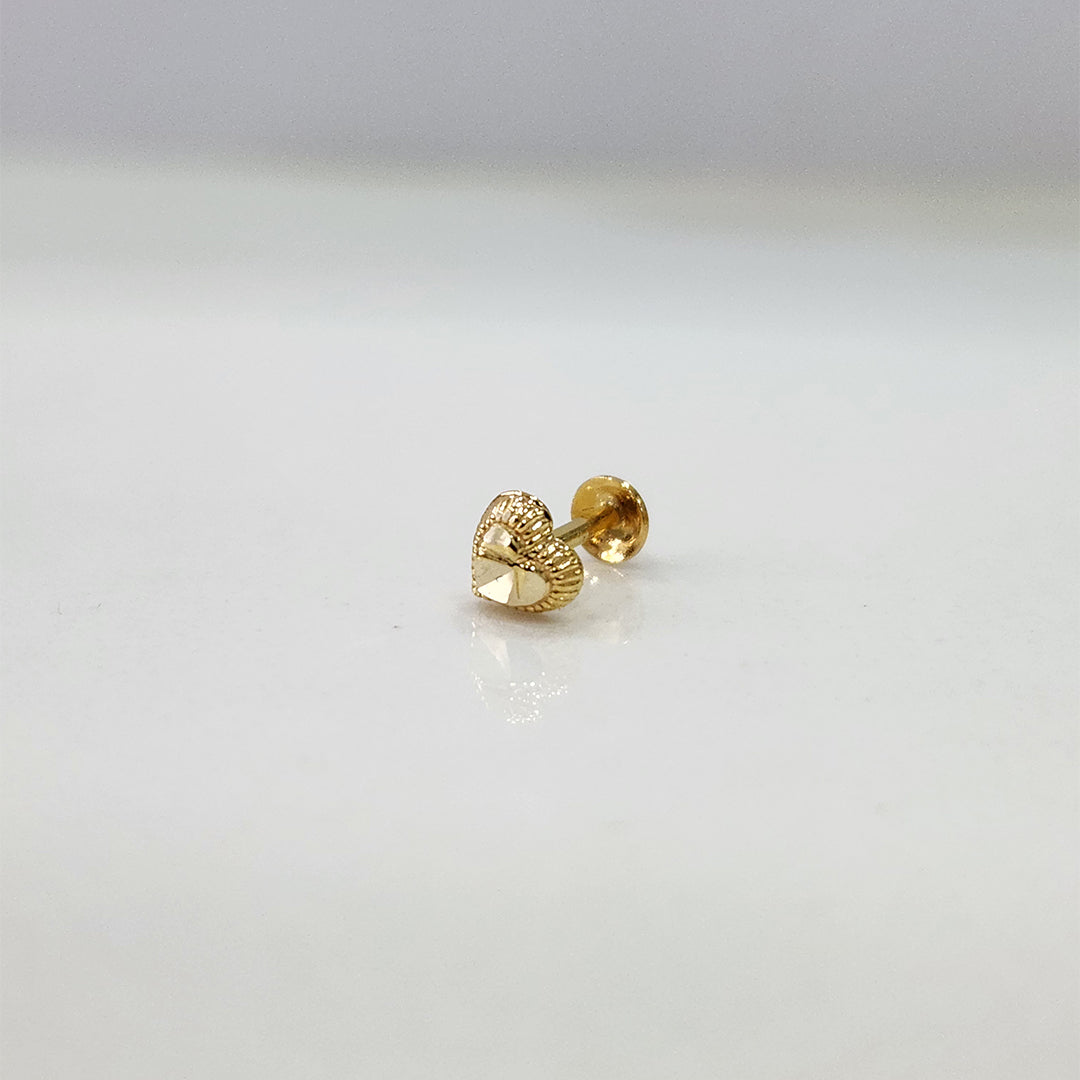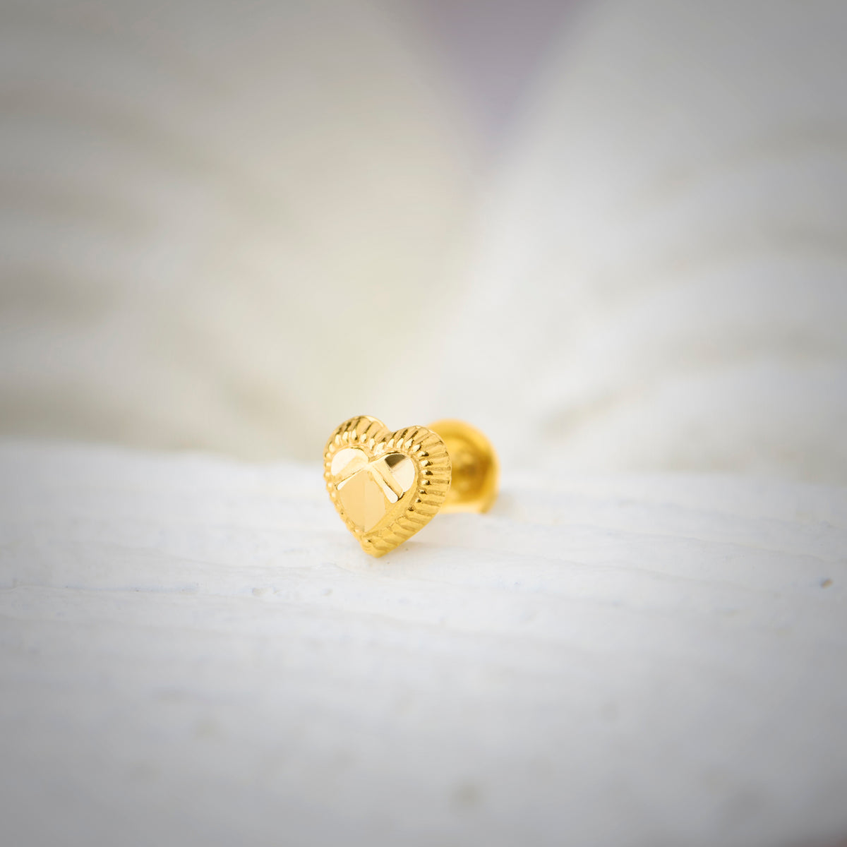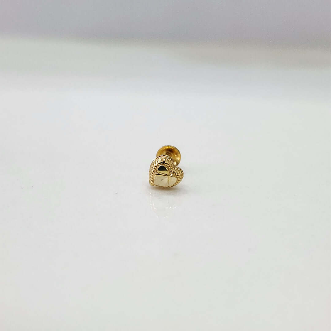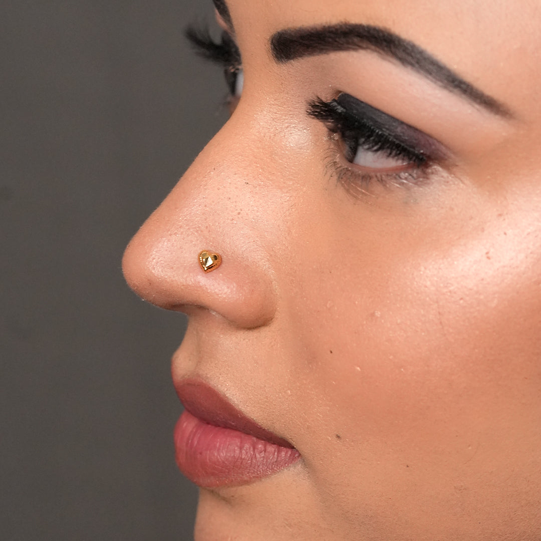 The nose pin is a slender heart shaped shape with a fine gold braid edging, with a smooth polished center that gives off a slight warmth and lasting appeal.