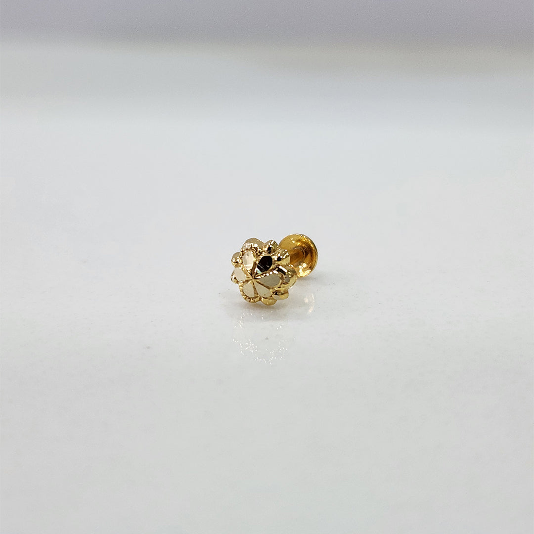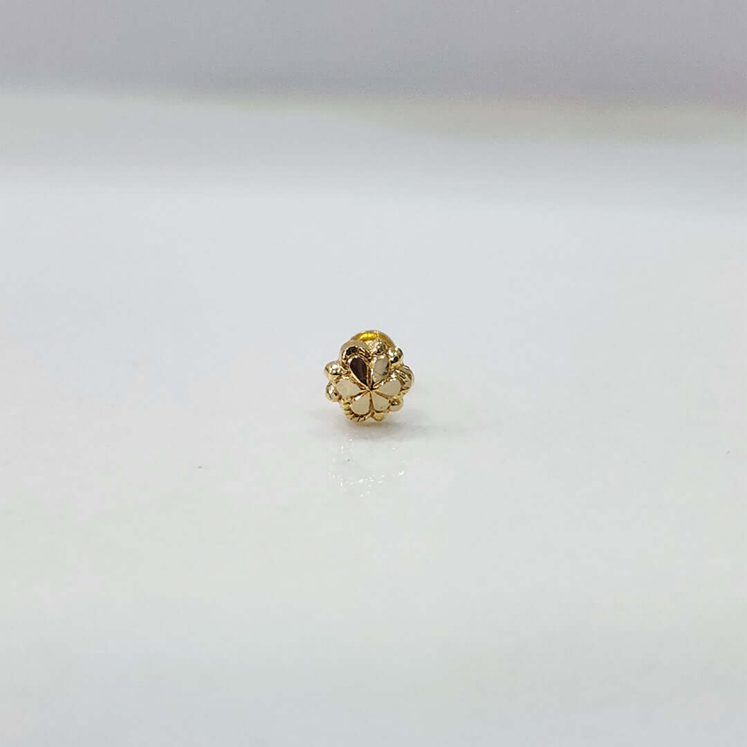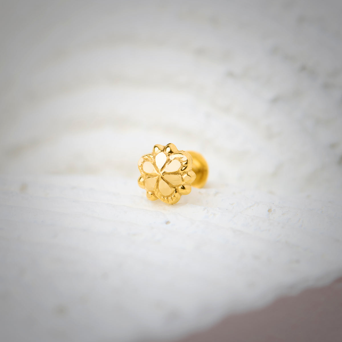 The small nose pin in gold is designed with interlocking petals of hearts with thin rope-like textures which give it a perfect balance of softness and craftsmanship.