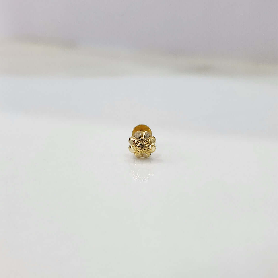 This small nose pin in gold has a bold and sculpted central dome with intricate petal and bead work, which is like a miniature sunburst that gives every look a touch of royalty and glowing beauty.