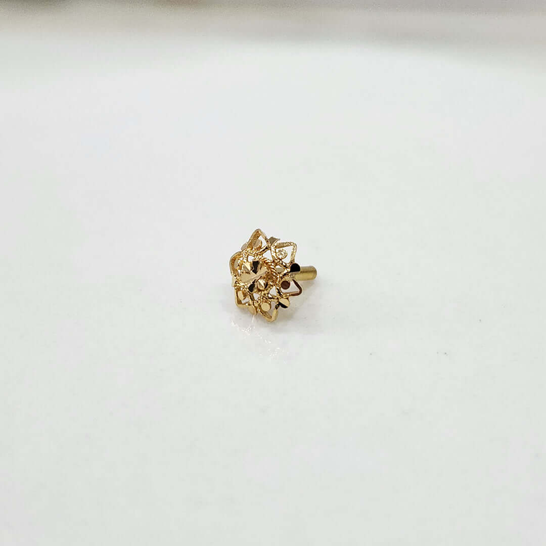 A beautiful gold nose pin with a complex filigree design, made to shine with every little movement.