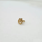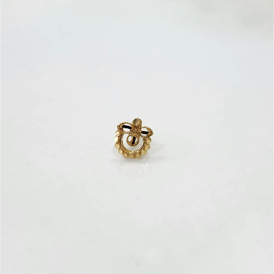 This small nose pin gold has a semi-circular or crescent shaped base with a faceted and glittery outer edge. Above the crescent is a floral or three leaf pattern, each leaf with a central black enamel accent to create dramatic contrast. The center of the floral design is a small looped or oval, which is also decorated with black enamel, which adds to the detailed work.