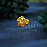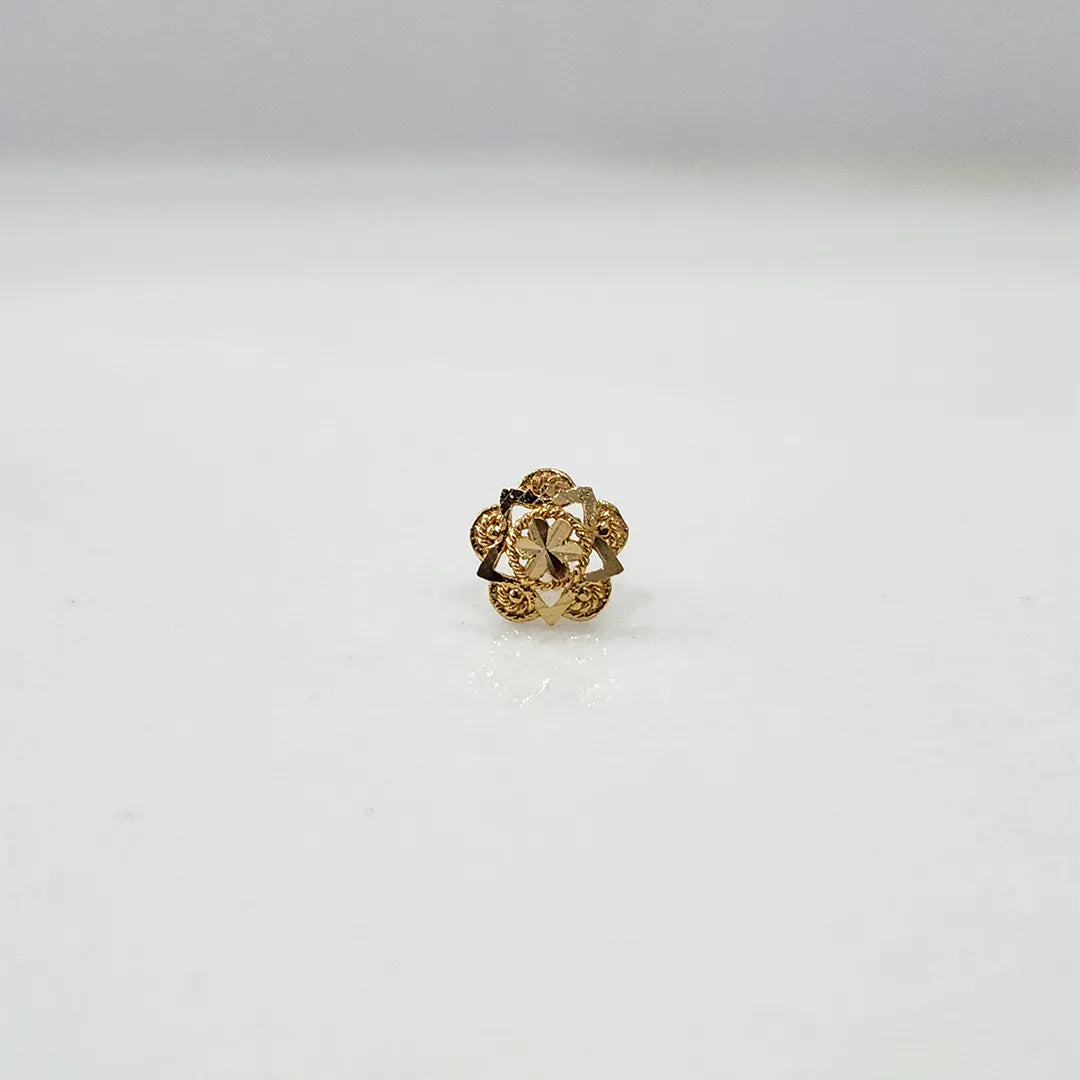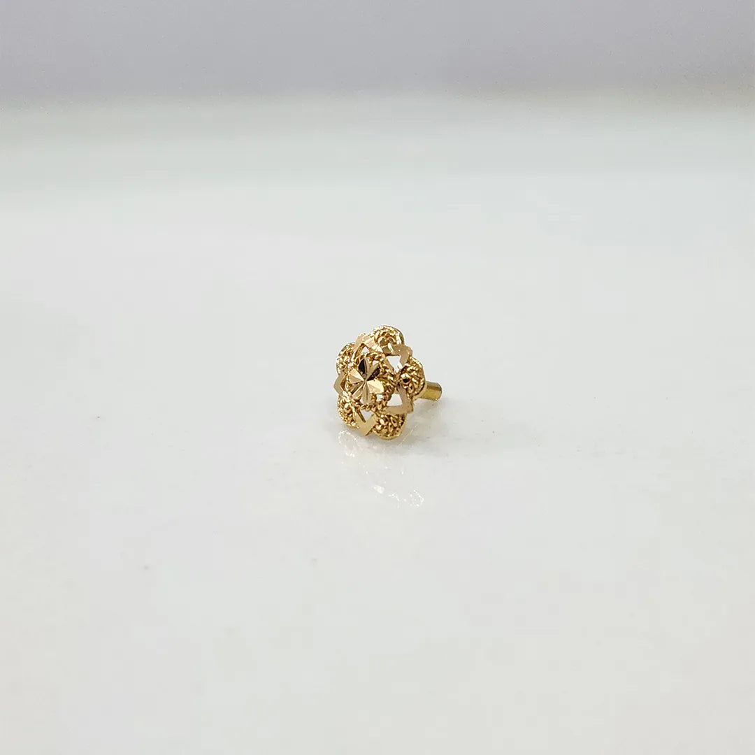 Carefully carved, this nose pin in gold has a faceted central dome surrounded by petal-like rays and fine beaded patterns, creating a beautiful, multi-dimensional star with a shimmering finish.