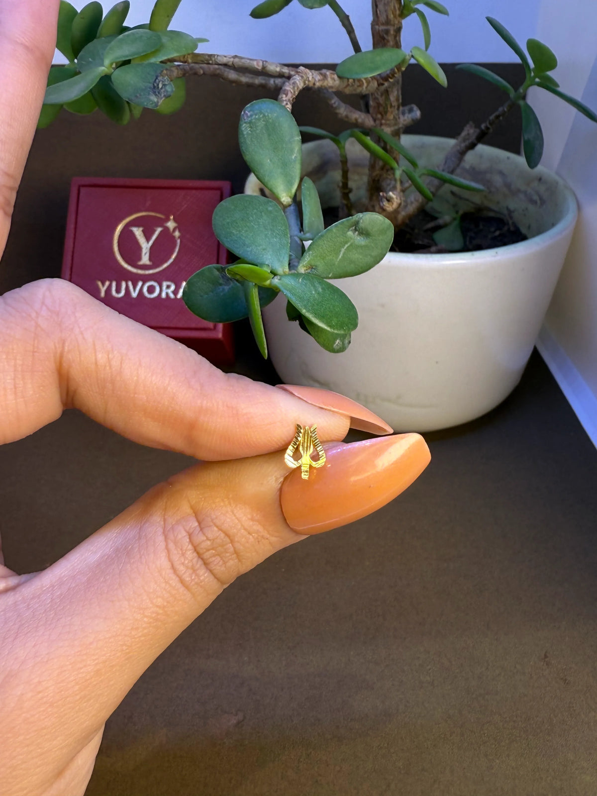 This small nose pin gold is expertly crafted with a bold trident design with finely ridged detailing to reflect and catch the light. Its dimensional lines are sculpted to provide a dynamic yet balanced appearance, reminding of the atmosphere of ancient talismans but being modern and versatile.