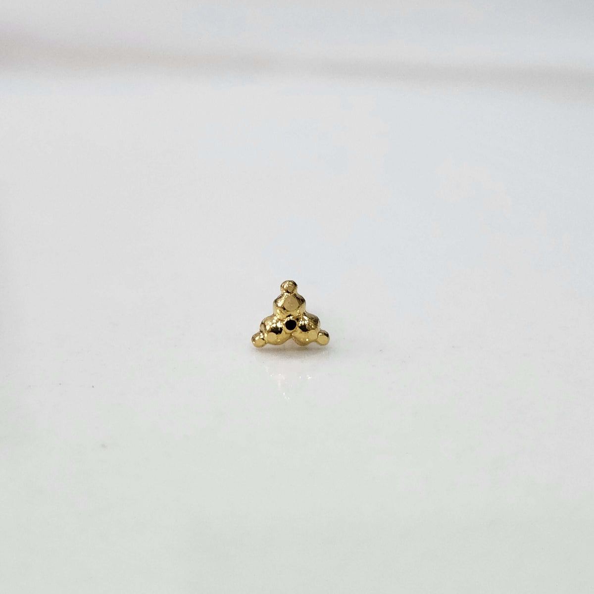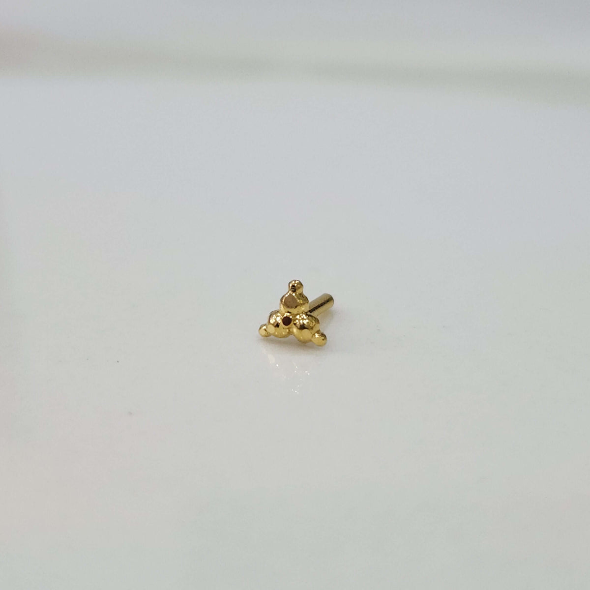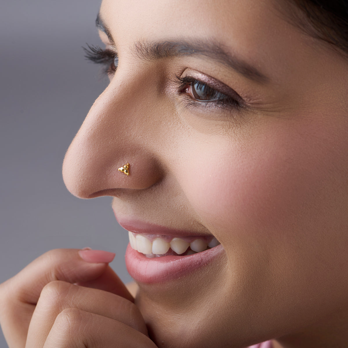 This gold nose pin features a plush triangular design of rounded beads, which forms a fluid and natural profile. It has gentle curves and smooth finish, which makes it a classic piece that does not overshadow your natural beauty.