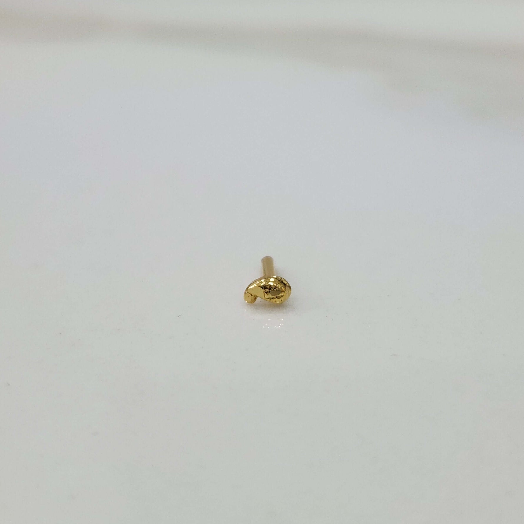 The gold nose pin has a small paisley outline with a slight textured finish giving it a bit of depth and personality to its shiny surface. The curvy, smooth shape is comfortable and secure, which makes it a universal accessory to any event.