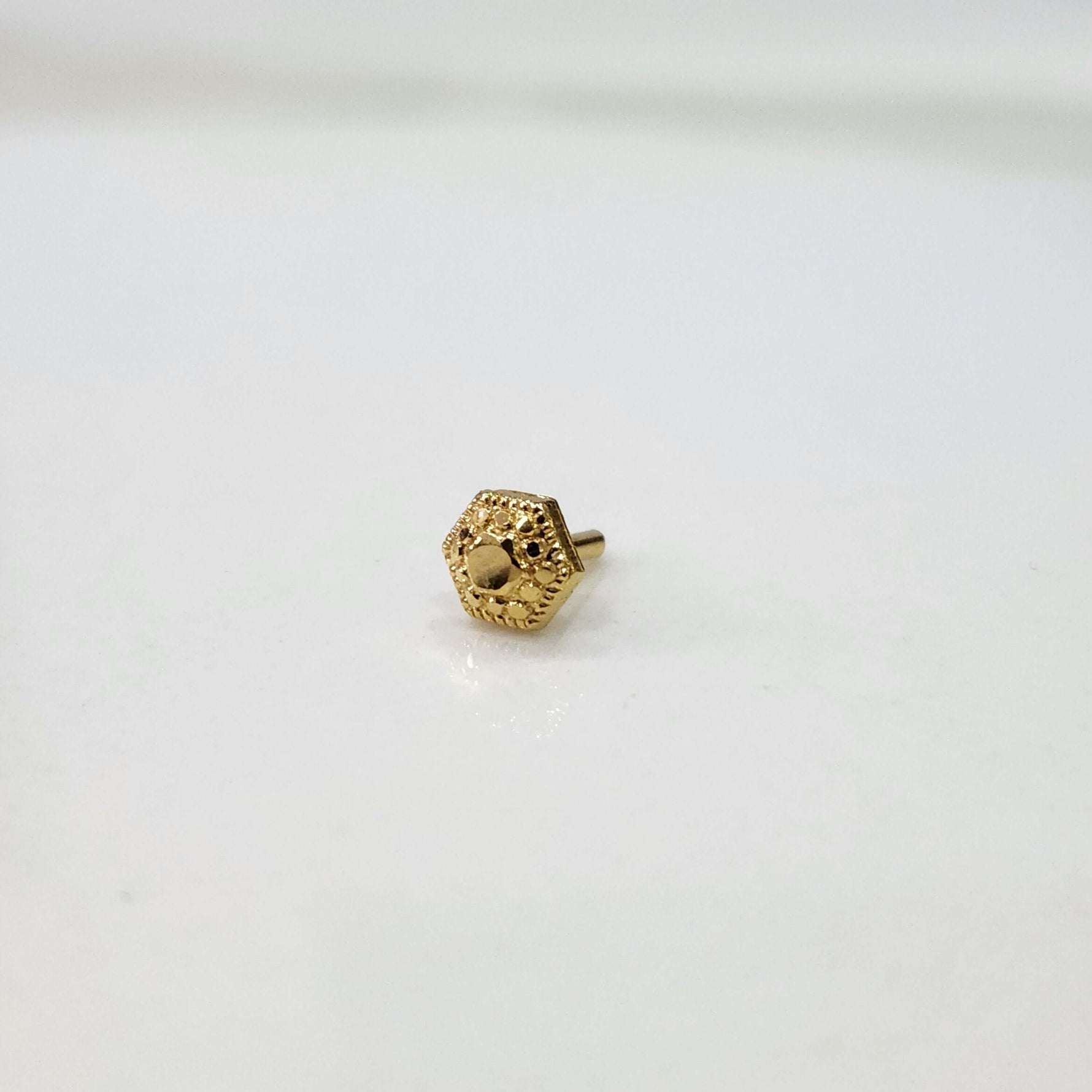 This hexagonal shaped small nose pin gold has a raised and polished center with a textured finish on the edges. The contrast between angular lines and faceted surfaces is dimensional creates a jewel-like effect that catches the light. Its small but daring design is a unique accessory which is perfect for people who like modern geometrical shapes with a hint of the classic charm.