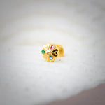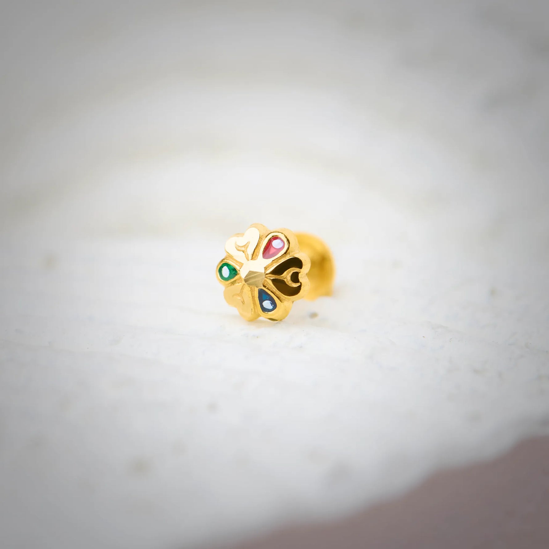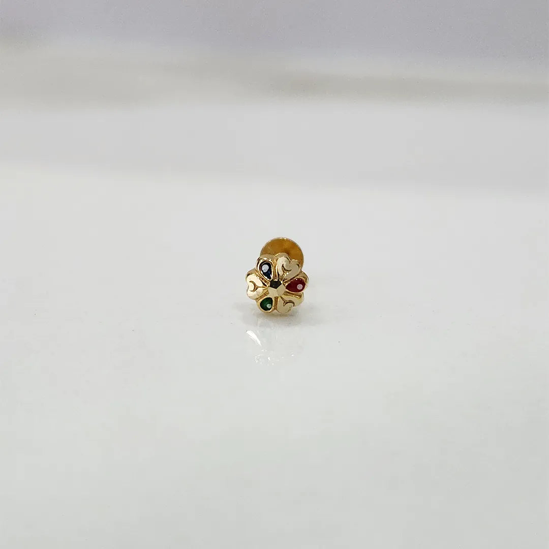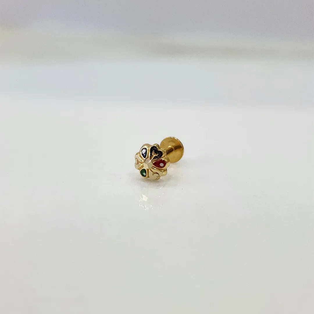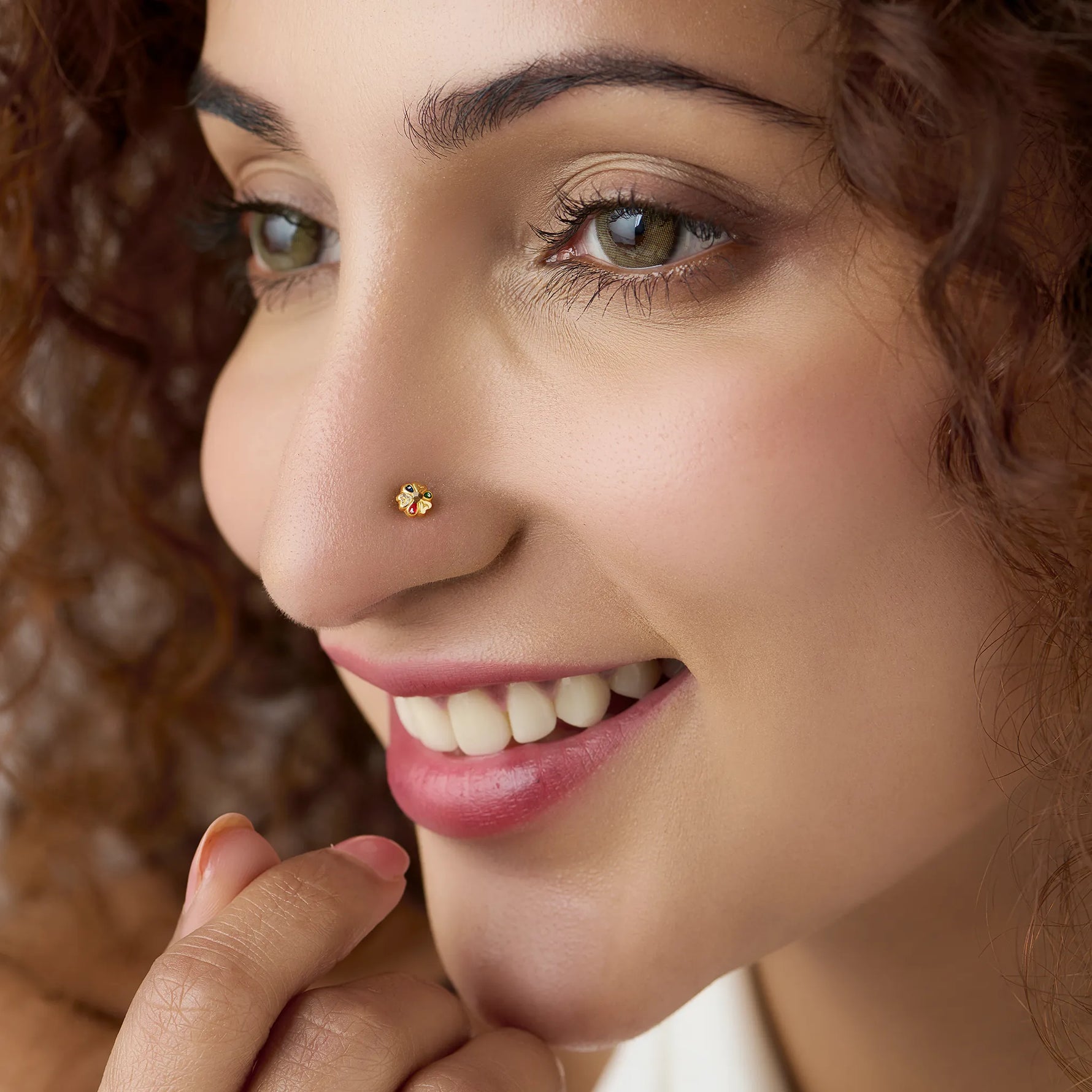The nose pin is made of a thin six-petal design with multicolored decoration of blue, red, green, and gold to give it a vibrant and magical piece.