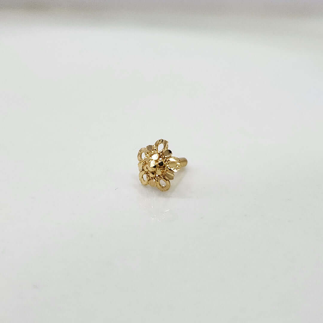 This nose pin in gold has five rounded petals surrounding a faceted central orb that is interlaced with textured gold loops and bead accents to form a balanced and elegant flower.