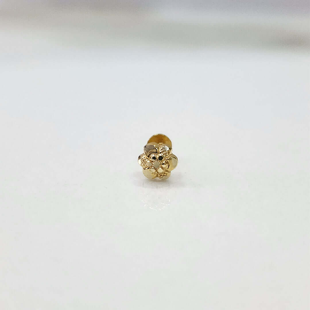 This nose pin in gold features a beautiful six-petal flower with smooth curves and glittering dark accents in the middle, making the nose pin elegant and playful at the same time.