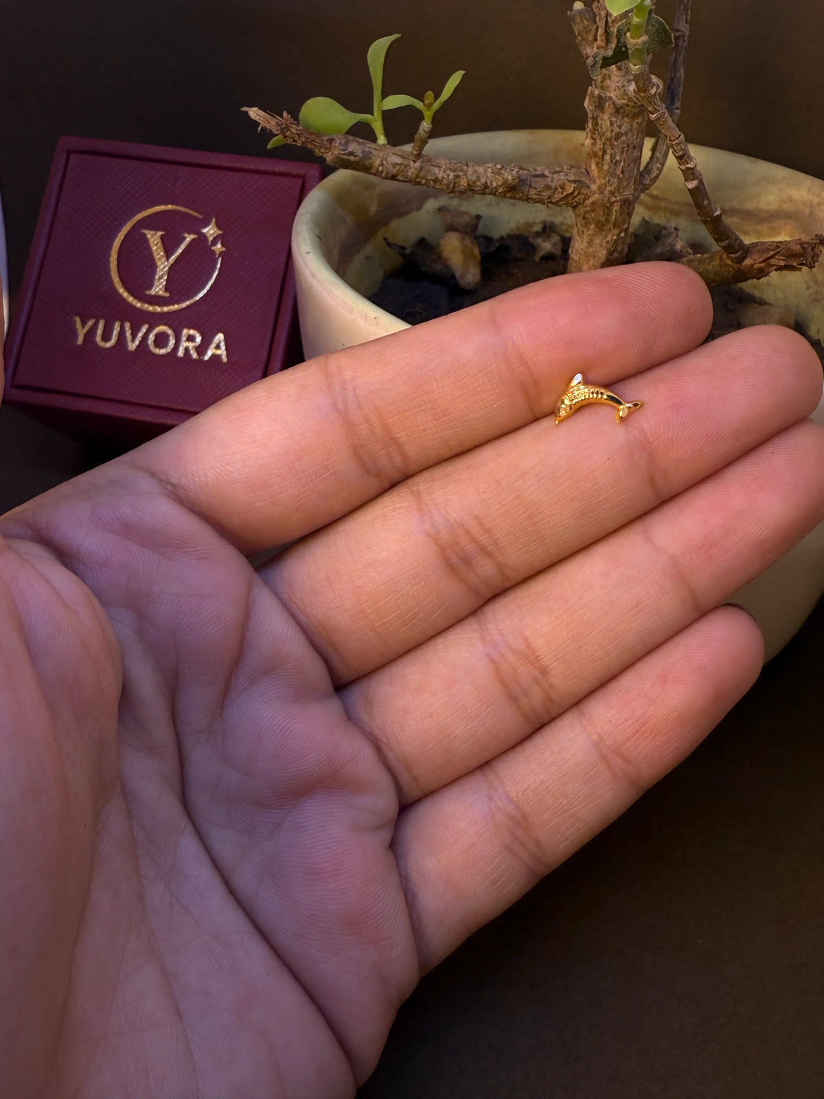 - Design: Dolphin-inspired plain gold nose pin
