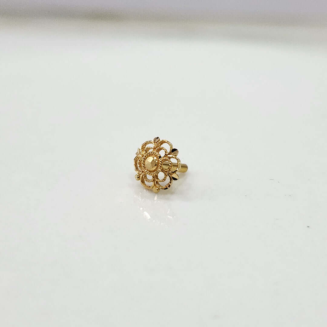 The nose pin is exquisitely designed with interlaced gold petals encasing a polished central dome, which has rounded bead decorations that provide it with dimensional shimmer and vintage glamour.