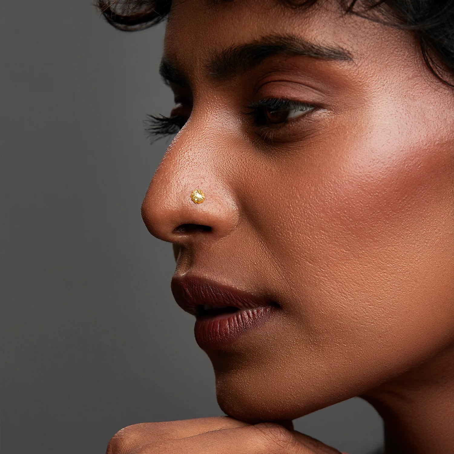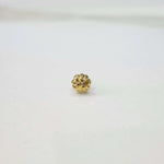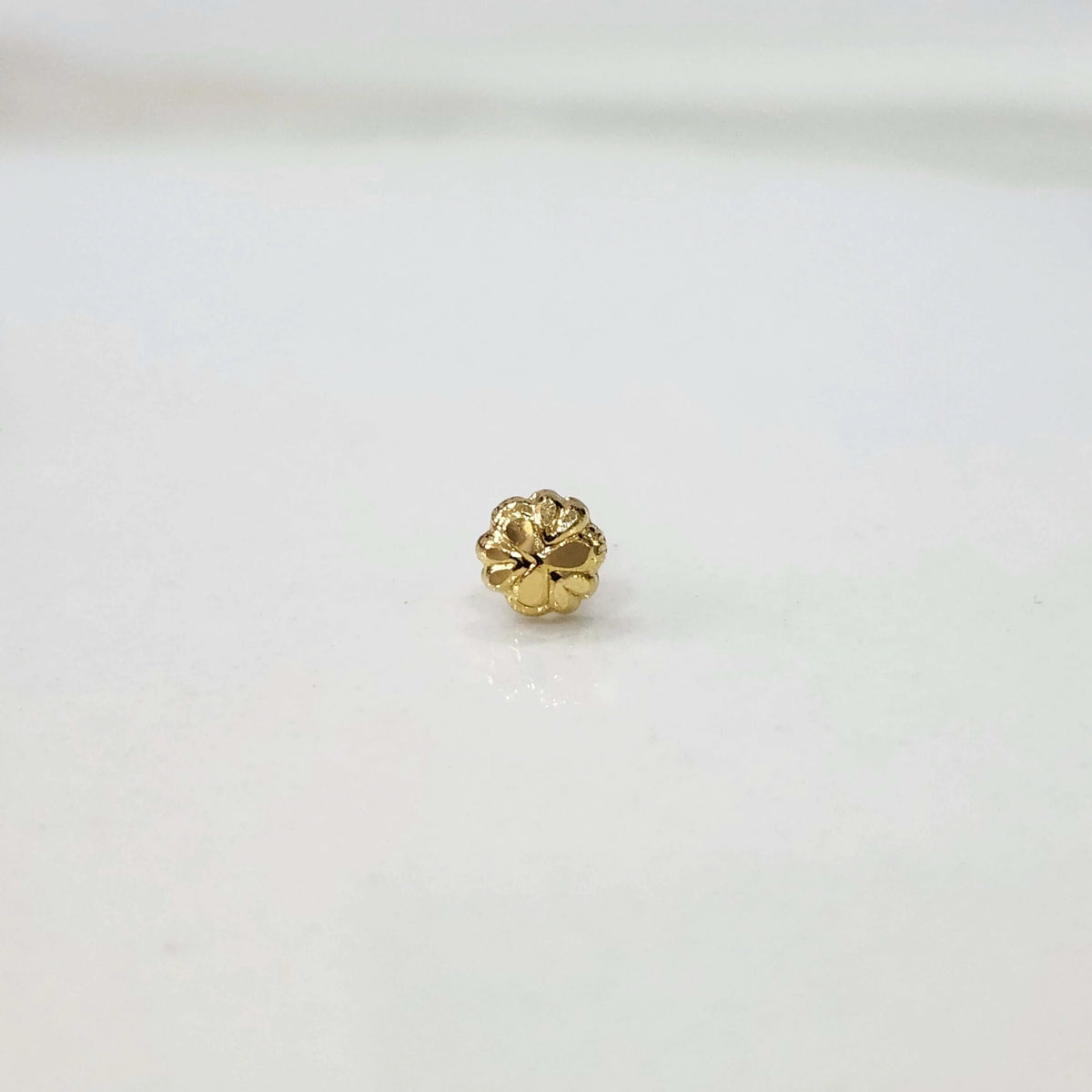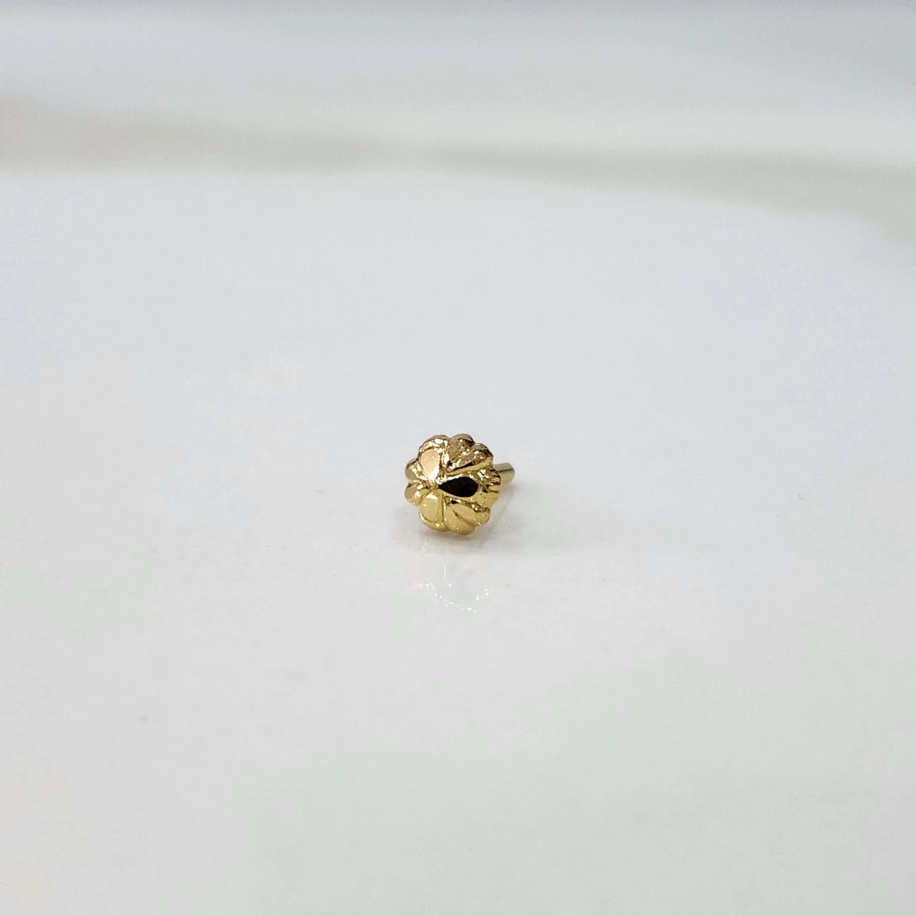 The nose pin in gold has a rounded bud-like flower with soft edges forming petals. Its small and patterned shape offers a subtle yet radiant accent, perfect to wear daily.