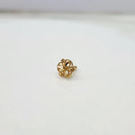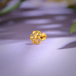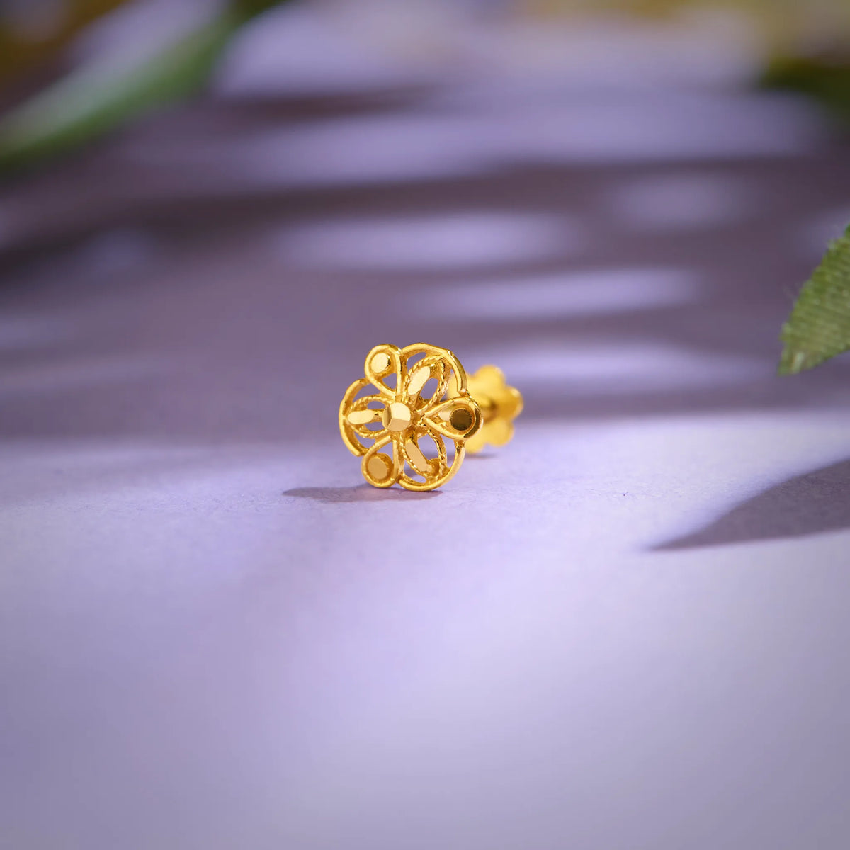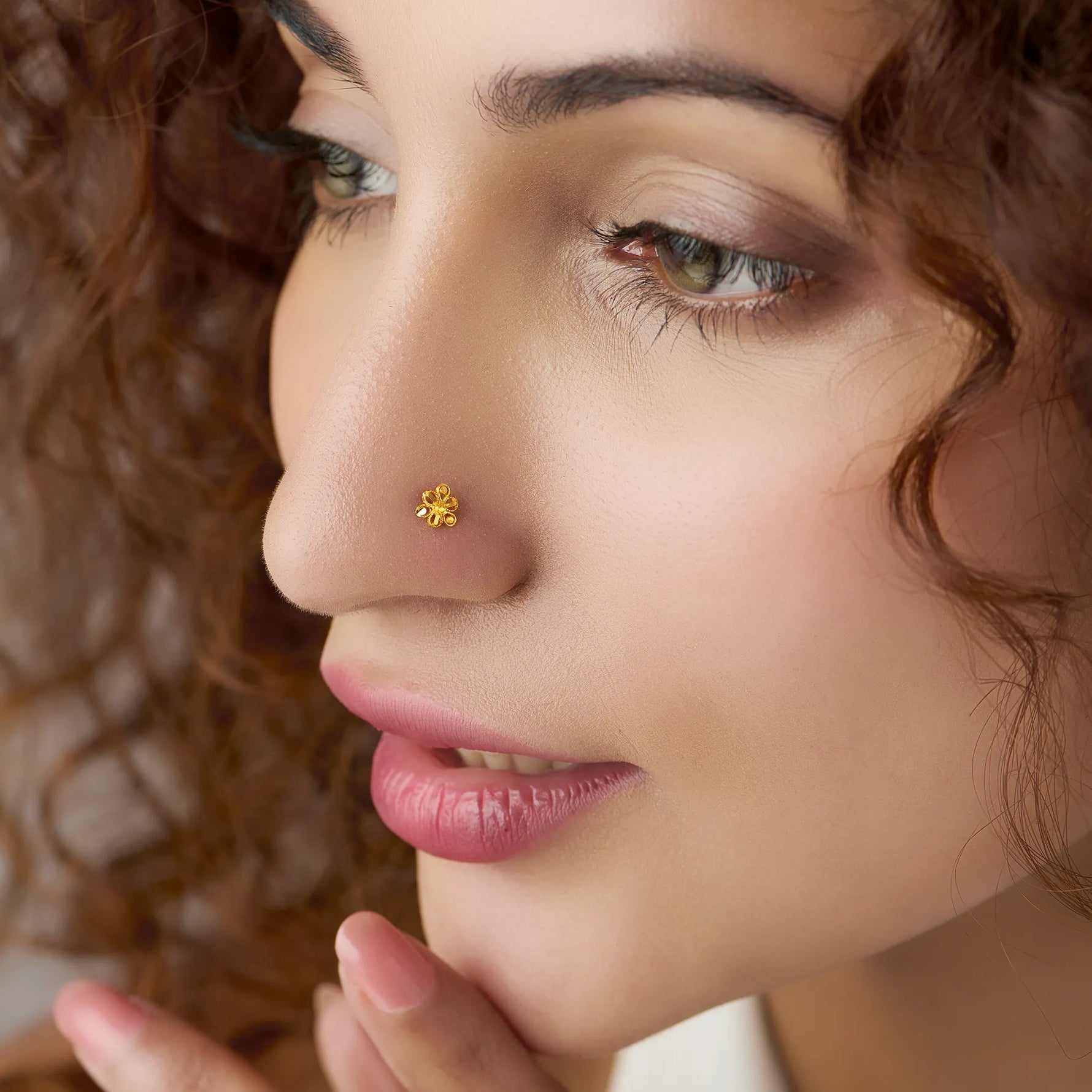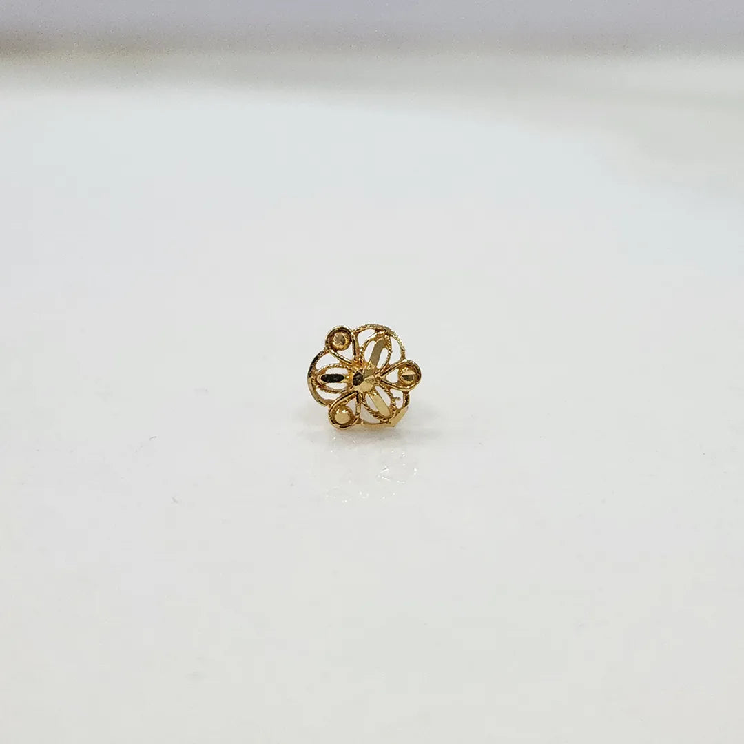 Crafted to perfection, the nose pin in gold is a combination of polished loops and faceted designs that radiate out of a central bead, creating a light and airy flower that sparkles with each glance.