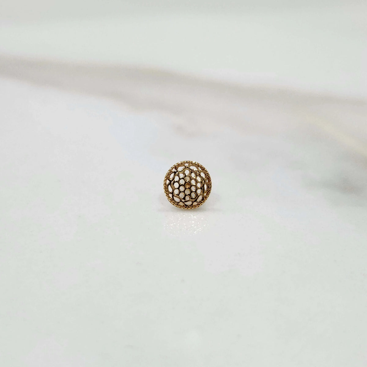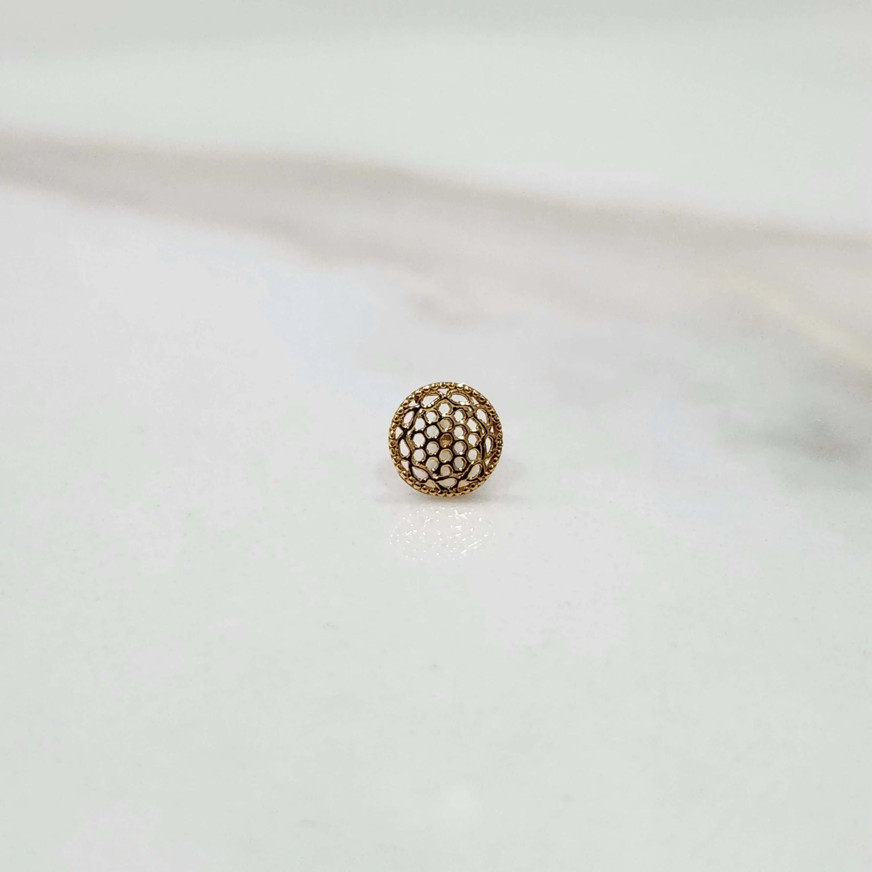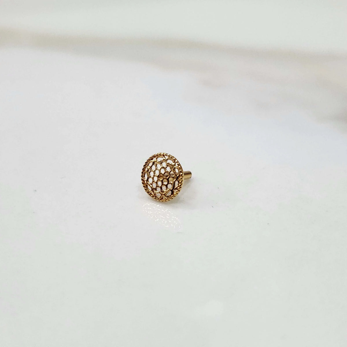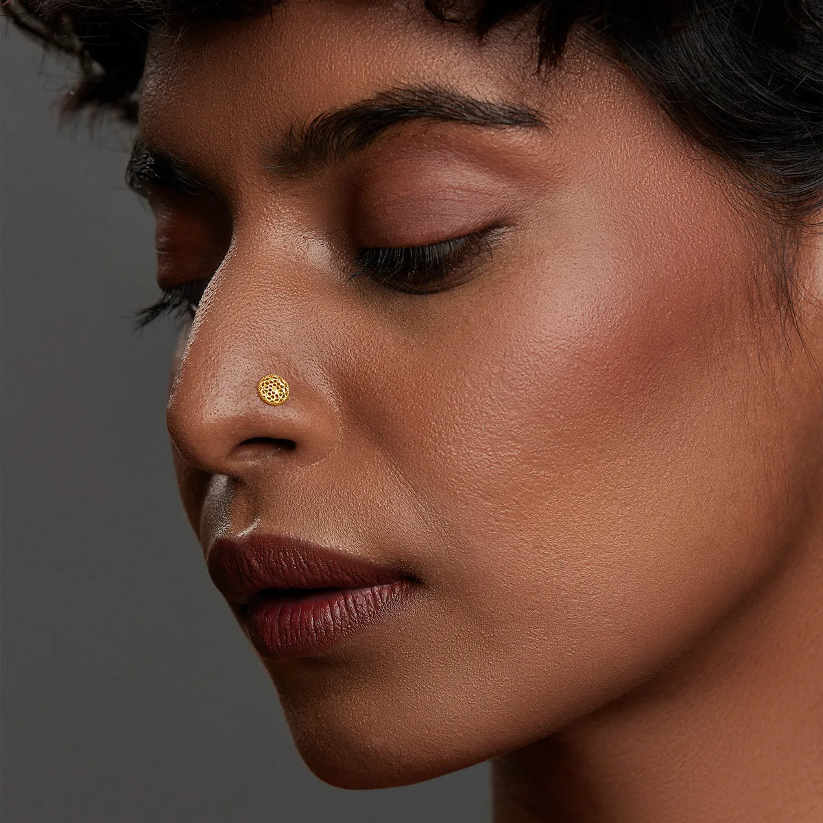 This round-shaped gold nose pin has a well carved flower design at the center. The petals are carefully placed to form a symmetrical and harmonious flower, and the openwork structure lets the light play through, giving the impression of airy and elegant. You can check out the price of this nose pin online.