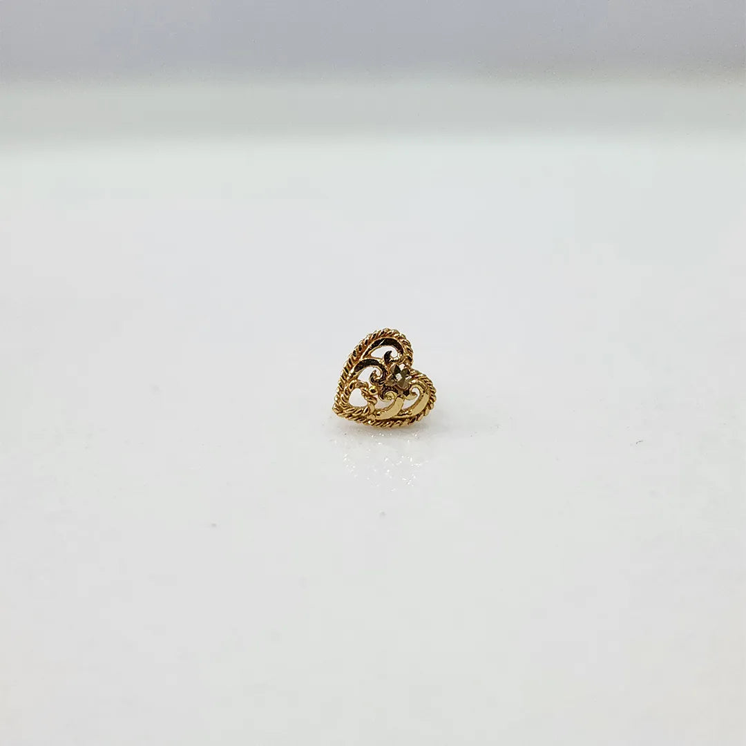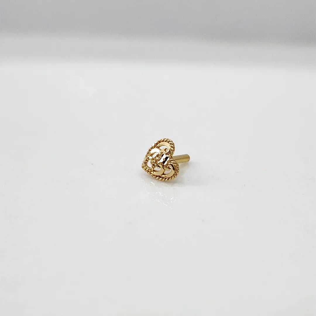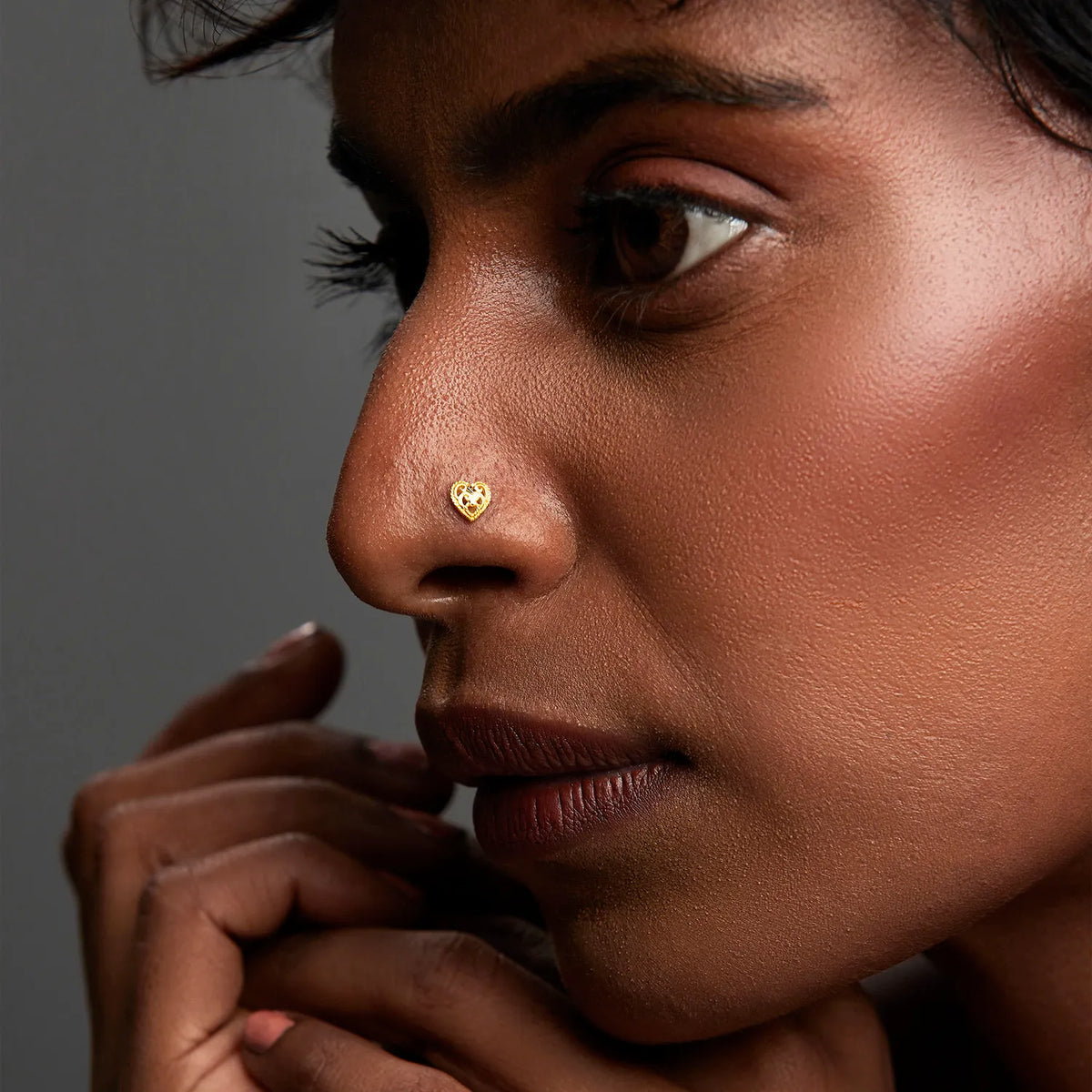 The nose pin in gold is carefully carved with three elegant hearts one inside the other, with fine scrolls and a glittering center to create a multidimensional effect.