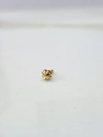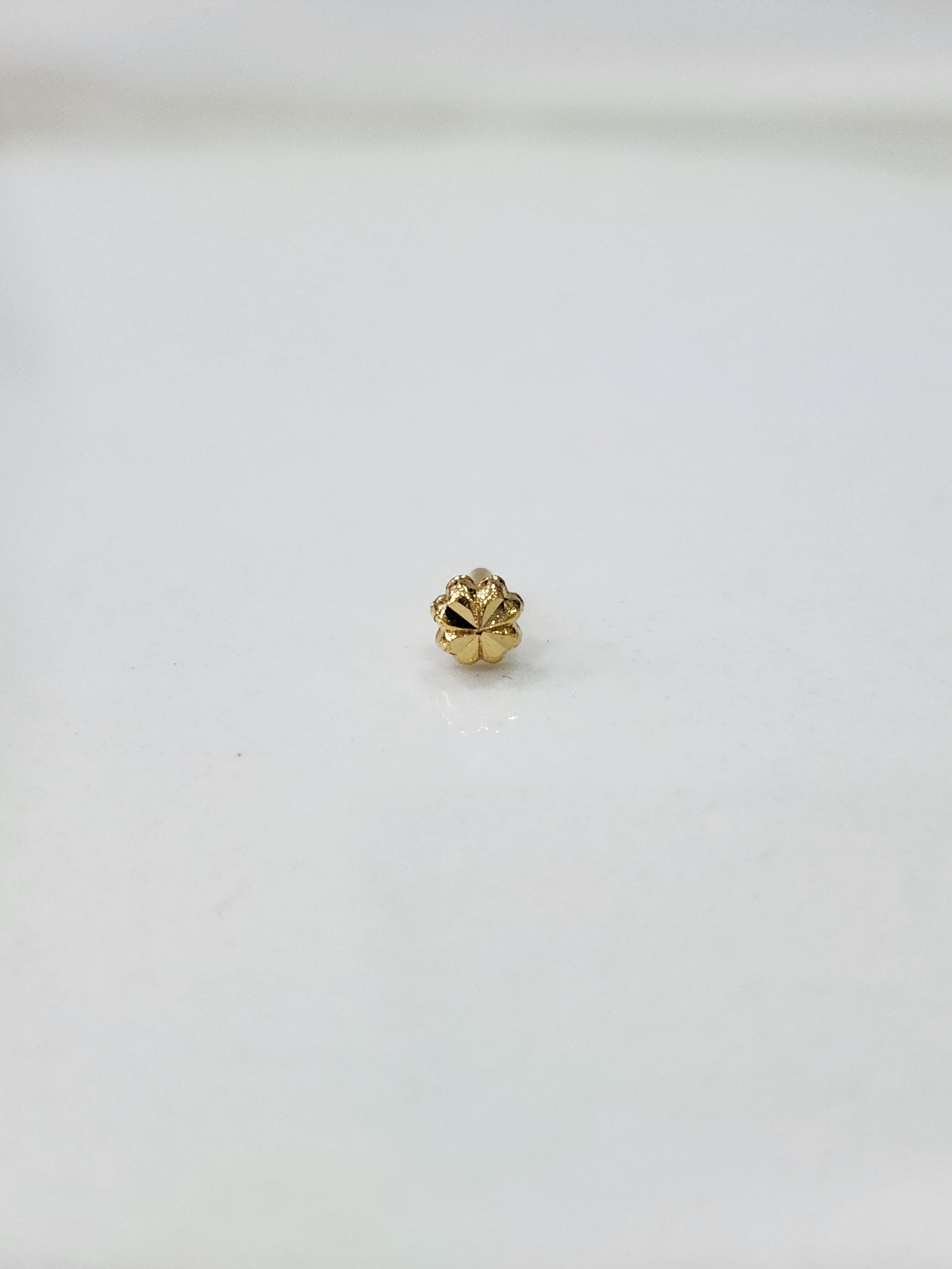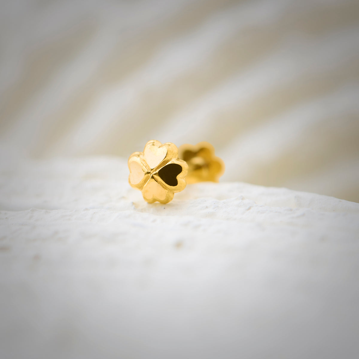 A small gold nose pin/stud with a dainty four leaf clover design, with petals cut with clean, symmetrical lines, giving a fresh, flowering appearance. The top of each petal is also lightly textured, giving it a light sparkle and dimension to its very polished minimalist shape.