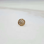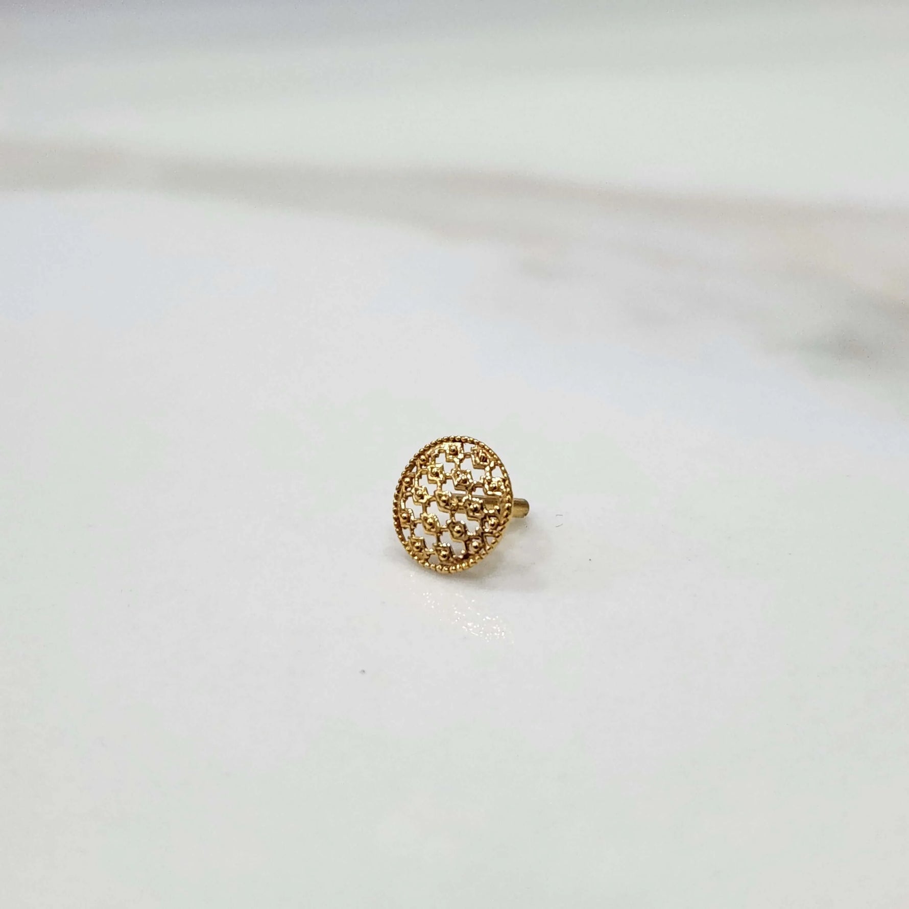This beautiful round gold nose pin is of fine lattice work, the core of it being a criss-cross mesh of diamond-shaped openings. Every intersection is decorated with small polished gold beads, which give it texture and a bit of a shimmer, which reflects the light perfectly. You can check out this small gold nose pin price only at Yuvora's website.