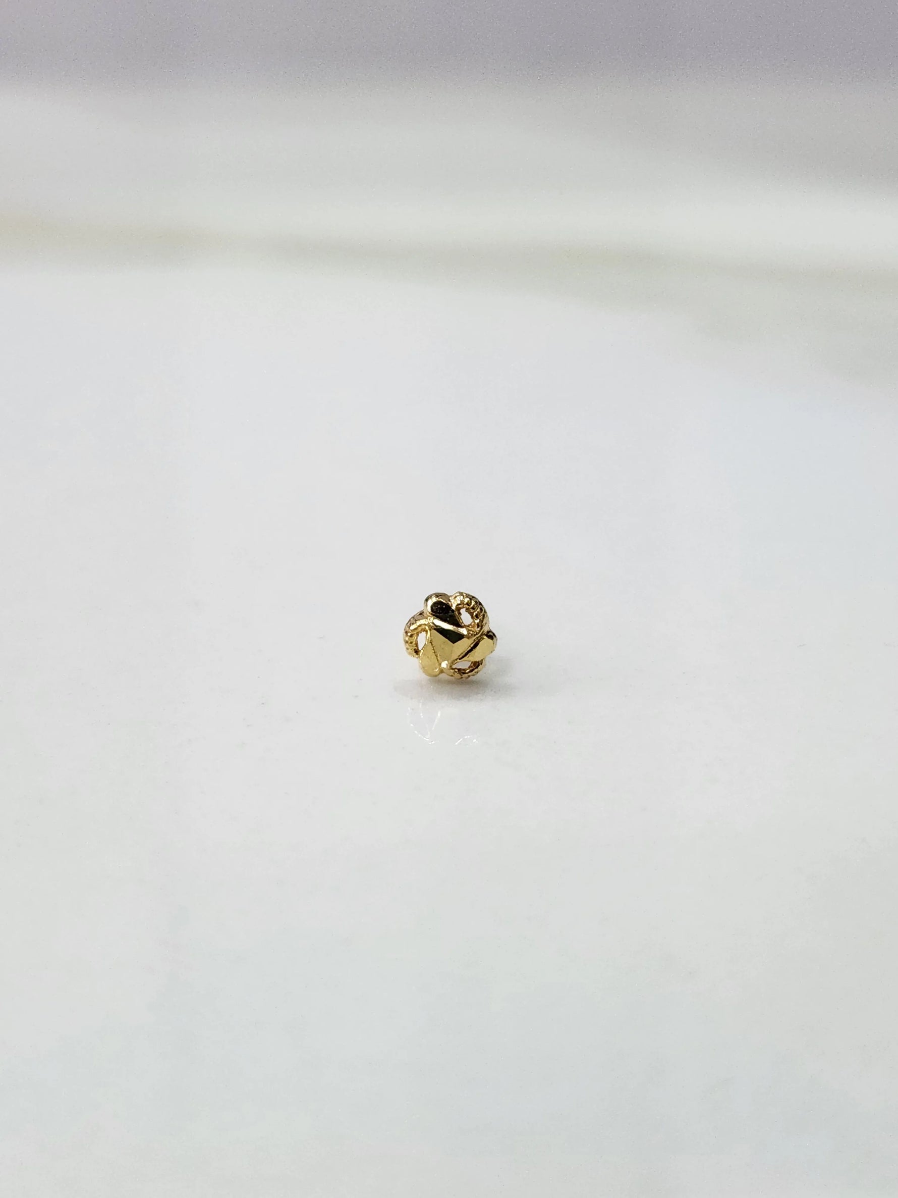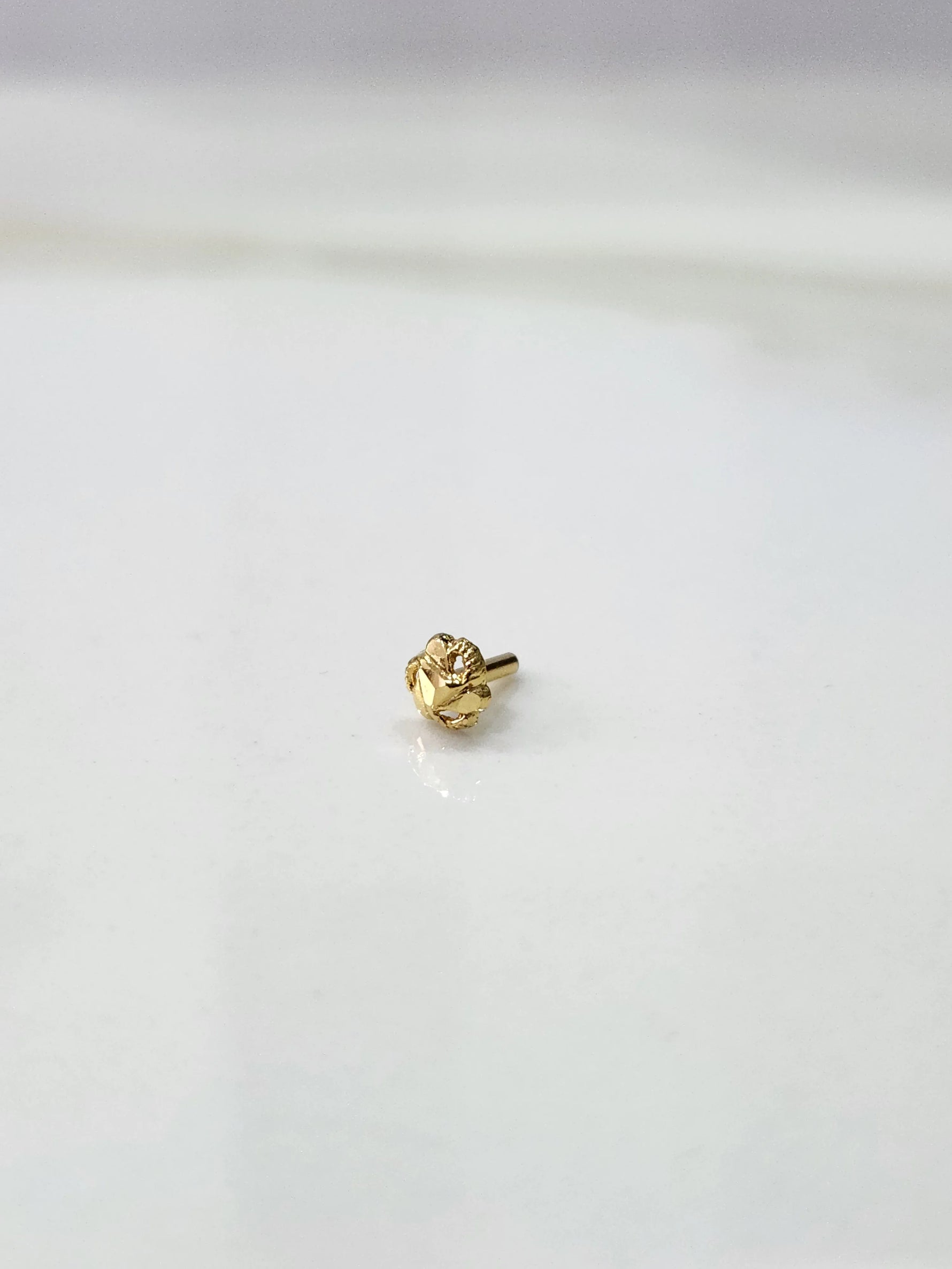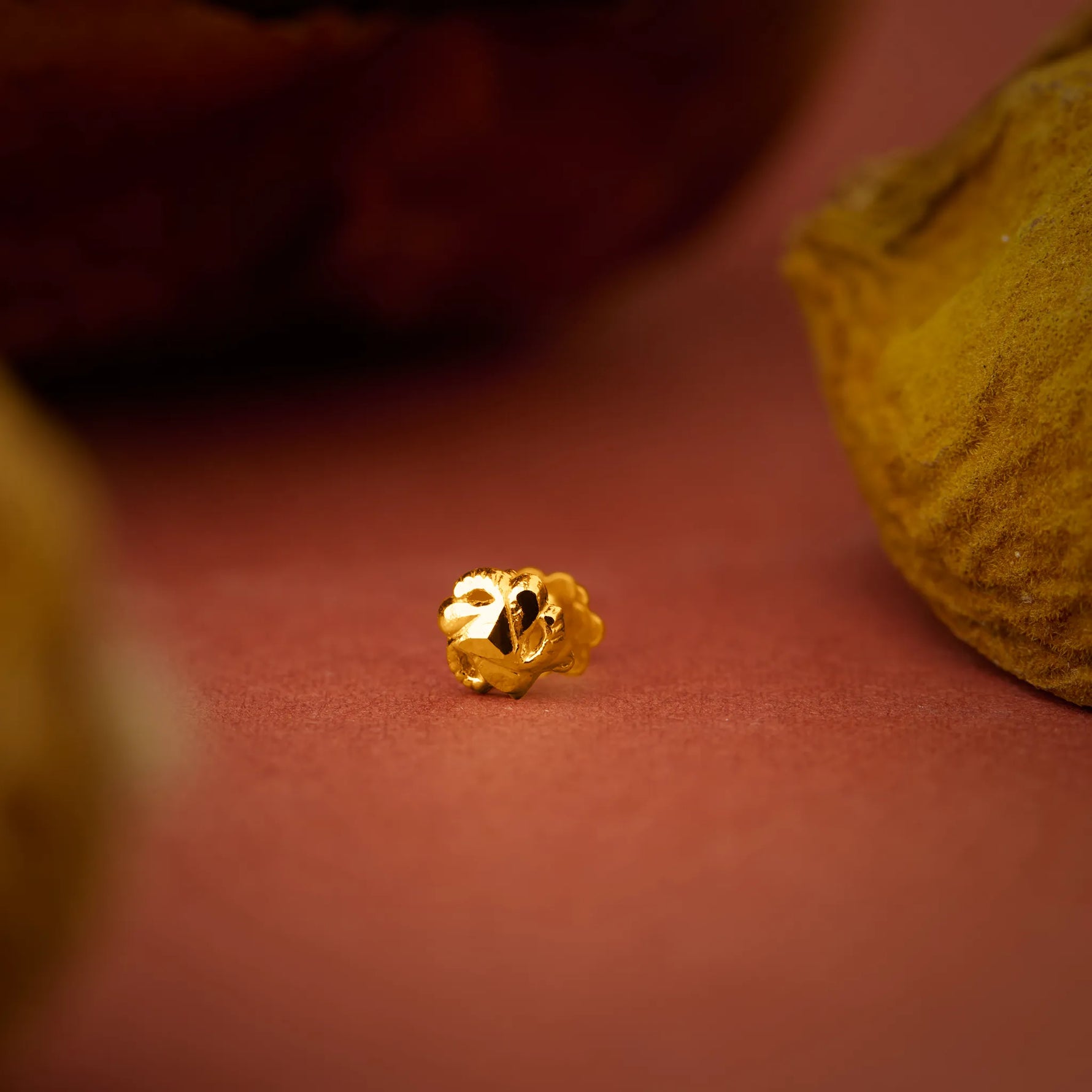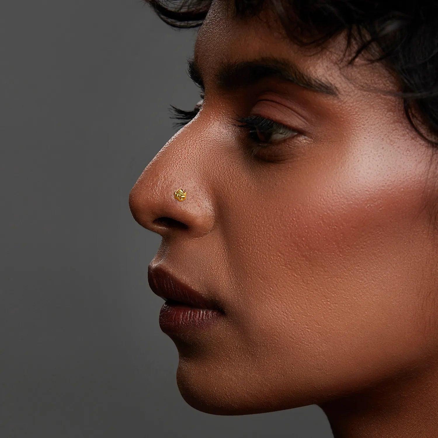 This gold nose pin is shaped like an eye-catching orb made of looping and twisted strands and polished surfaces that blend together. The contrast of smooth and textured surfaces makes the play of light and shadow dynamic, making the piece bold and yet sophisticated.