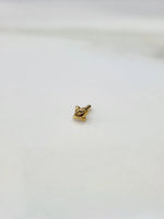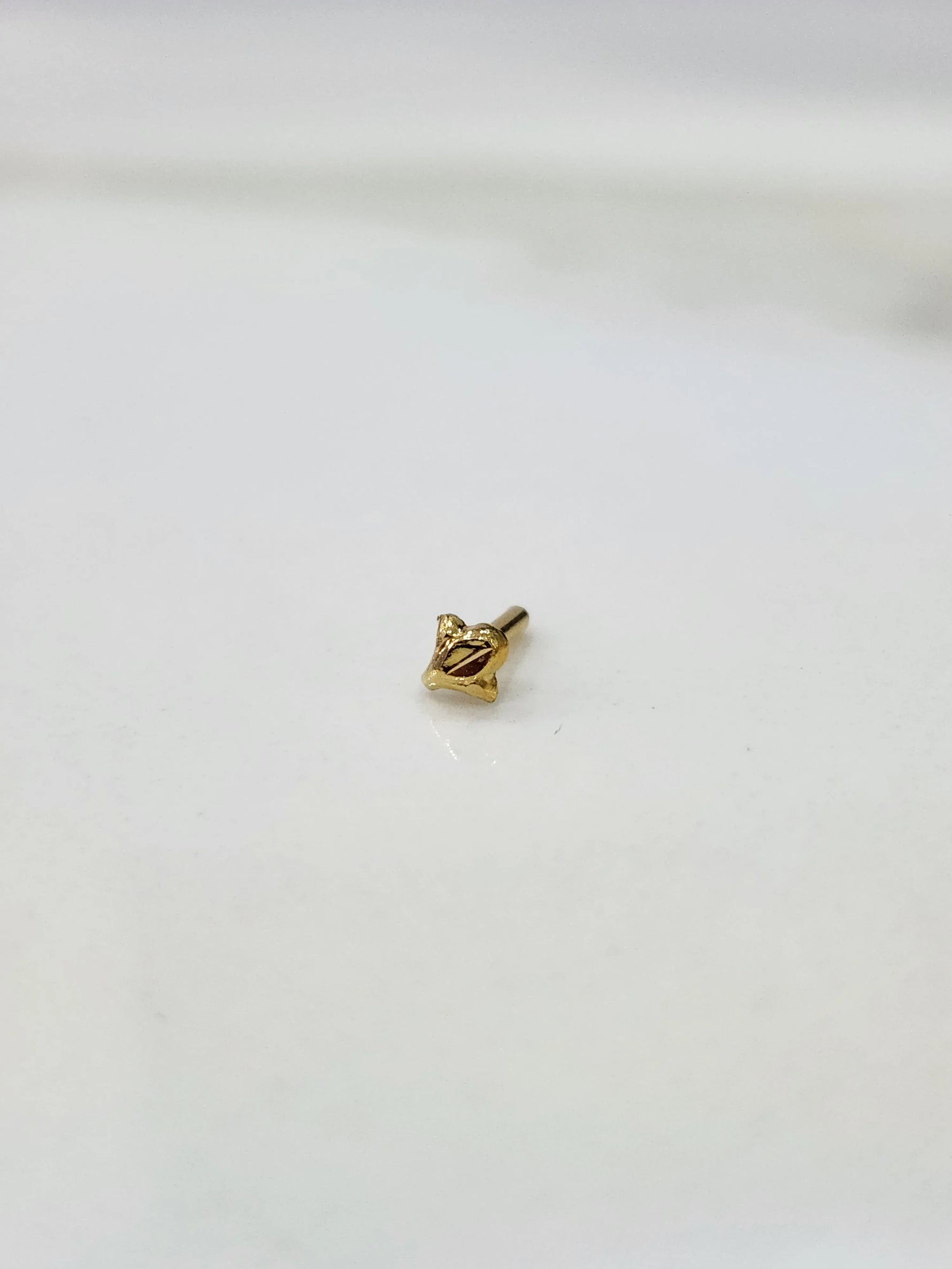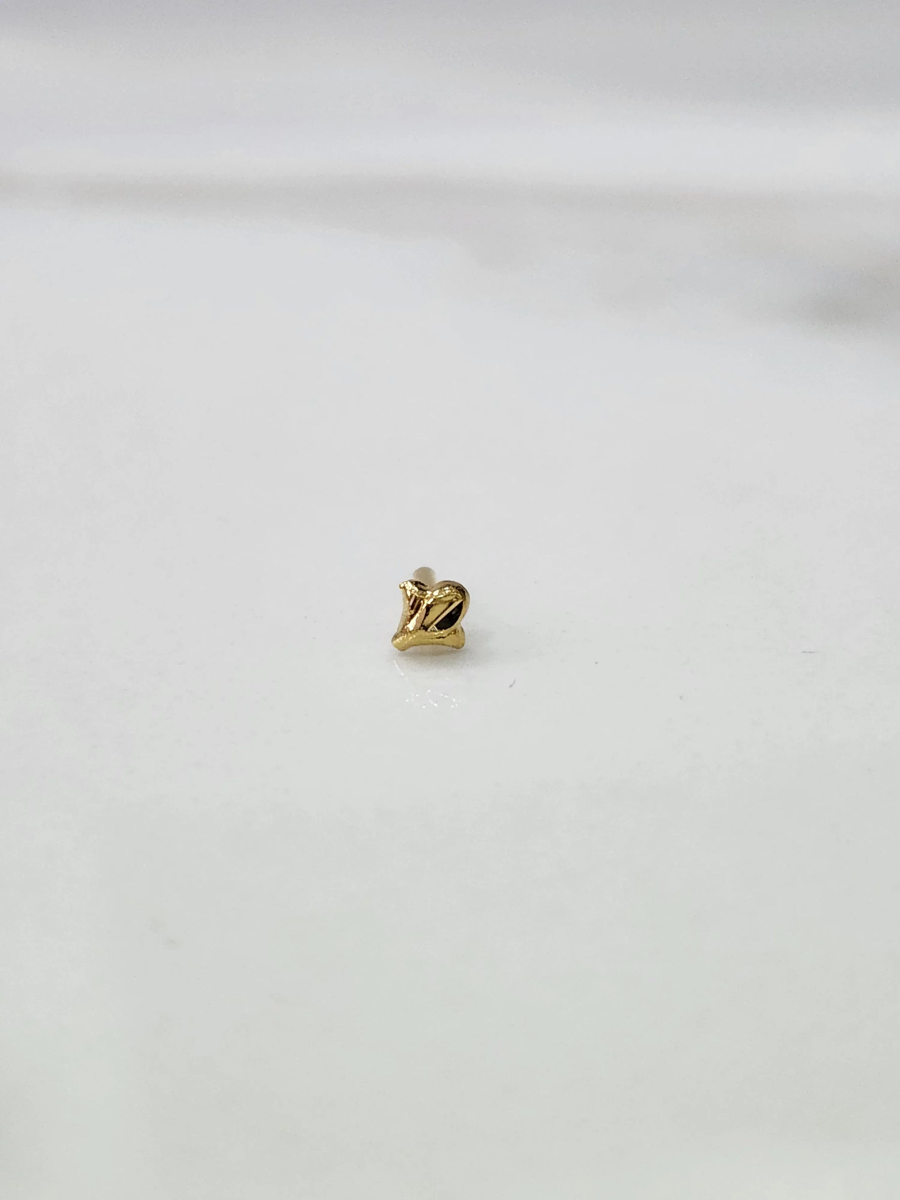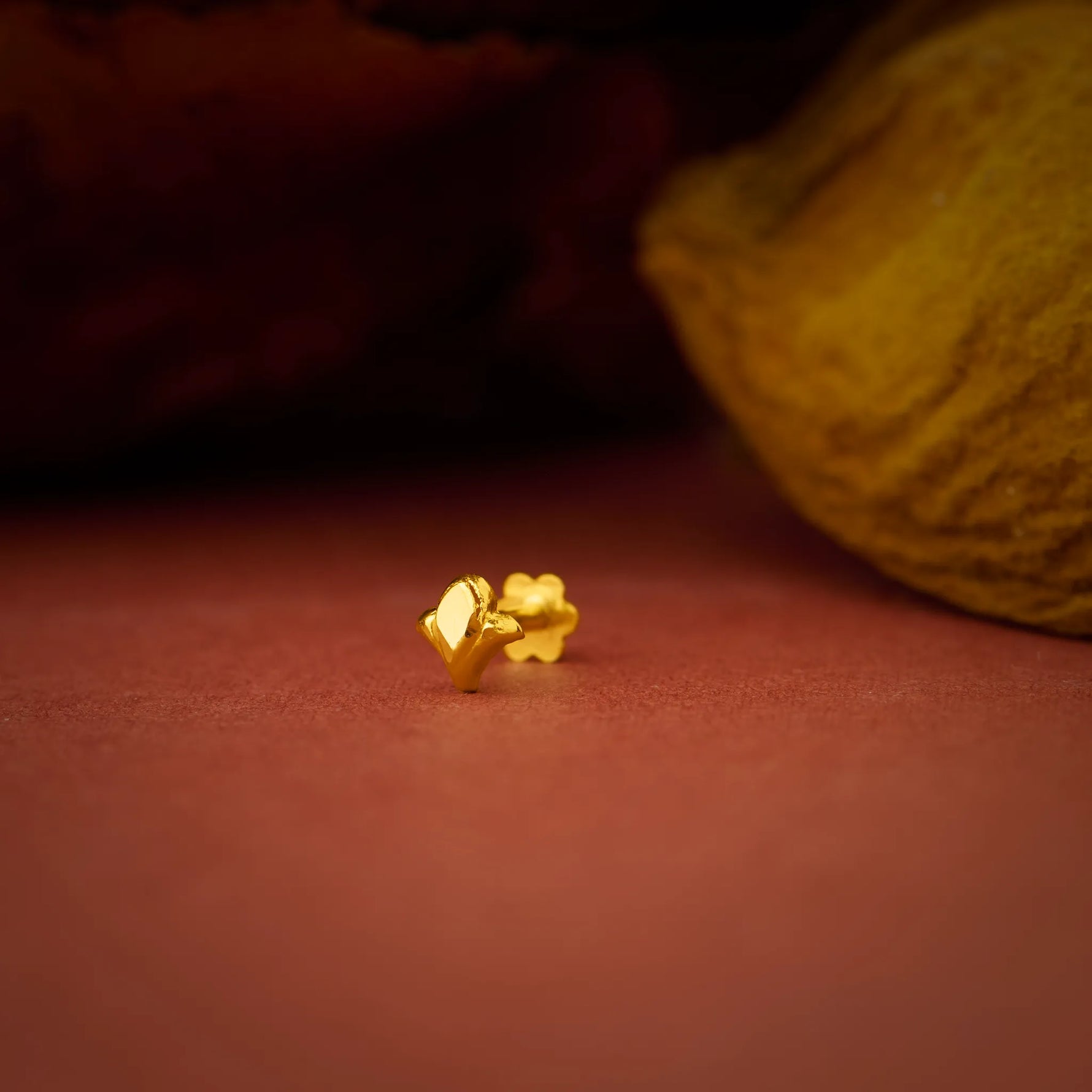 A simple small nose pin in gold or stud with an abstract, asymmetrical design with soft curves and folds, one side embossed to give depth, and a strong angled ridge that resembles a vein or petal design, smooth and ridged textures to give visual interest.