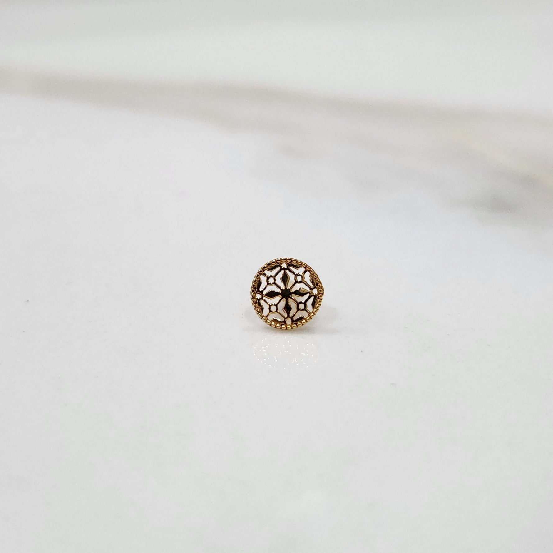 A gold nose pin of a round shape with a strong symmetrical flower-like design with four petal-like elements emanating out of the center. The petals are framed in the openwork, which makes them look airy and lace-like. A delicate beaded edge surrounds the work, providing a little texture and emphasizing the detailed workmanship.