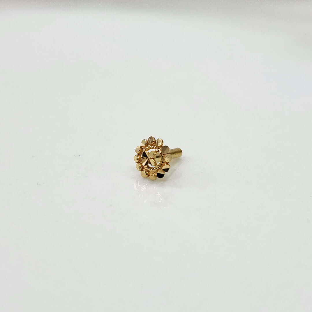 This nose pin is expertly designed with a large central motif and a textured, faceted petal design that looks like a flowering crown, giving a bright and dimensional finish that sparkles with every movement.