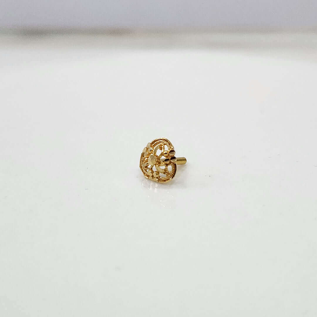 A beautiful gold nose pin with a canopy-like filigree and petal designs, meant to glitter just a little bit with every movement.