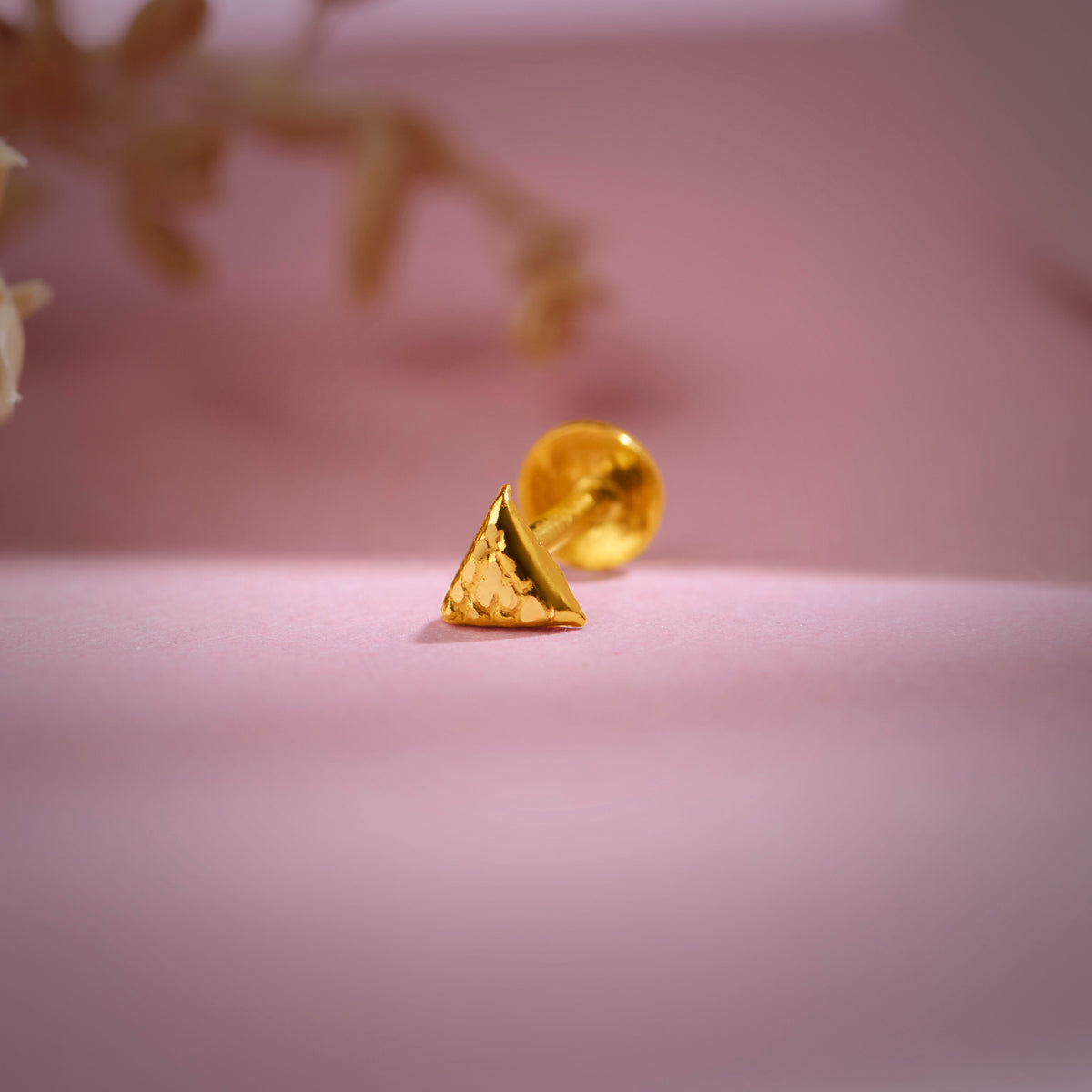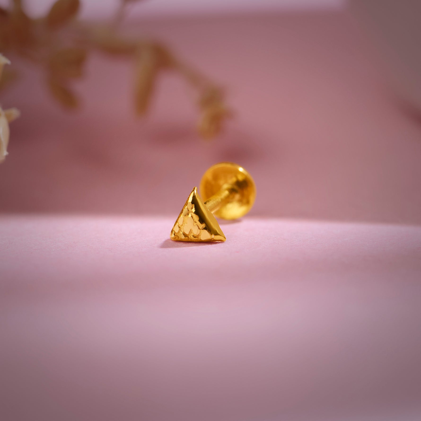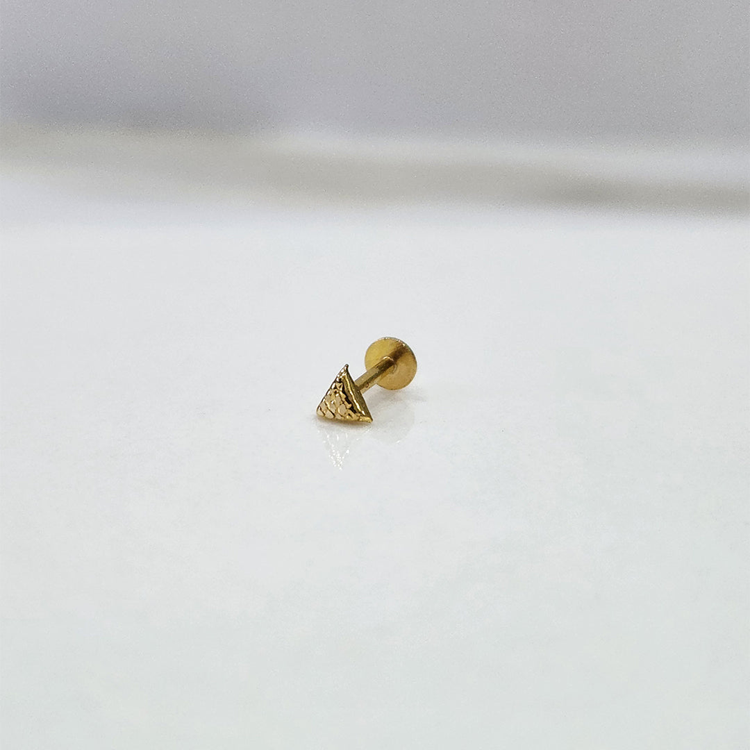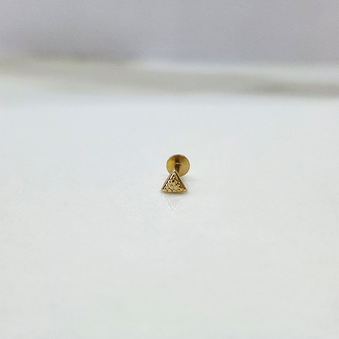 This small nose pin in gold has a strong triangular face with latticework detailing, which is both artisanal and minimalist in its design, making it a very modern appearance.
