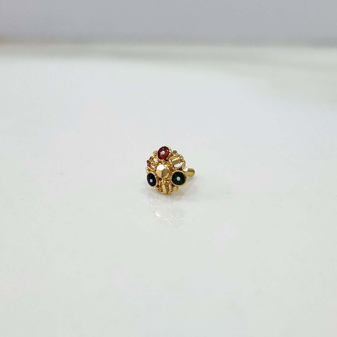 The gold nose pin is expertly made with three brightly colored gemstone accents of deep red, forest green, and midnight blue, surrounding a central faceted orb, and all are connected by fine open goldwork loops that glimmer with multidimensional light.