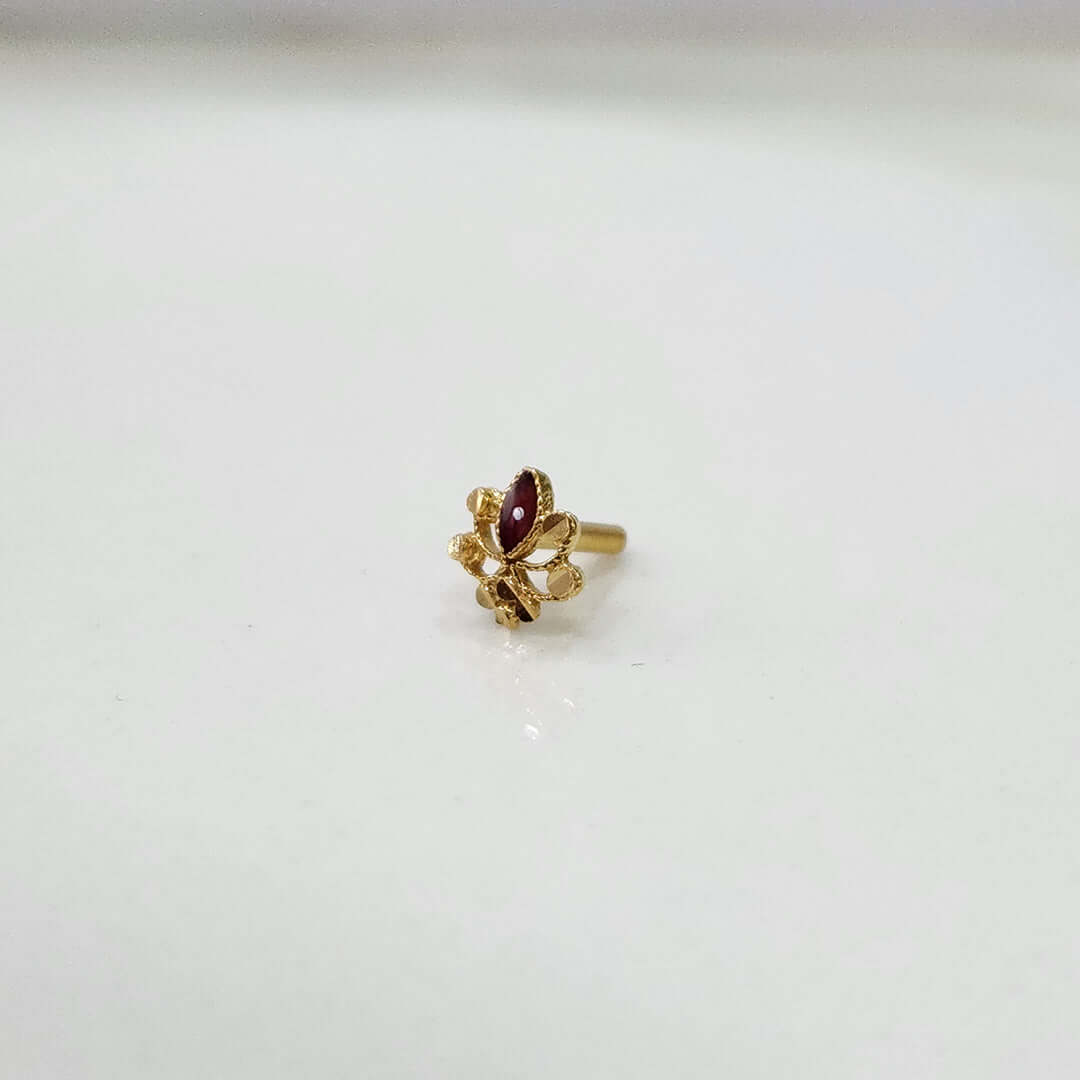 This nose pin is finely made with a deep garnet marquise centerpiece set in a bright gold corona of sculpted open arcs and bead detailing, giving it a dramatic, dimensional flourish that radiates with a stately glow.