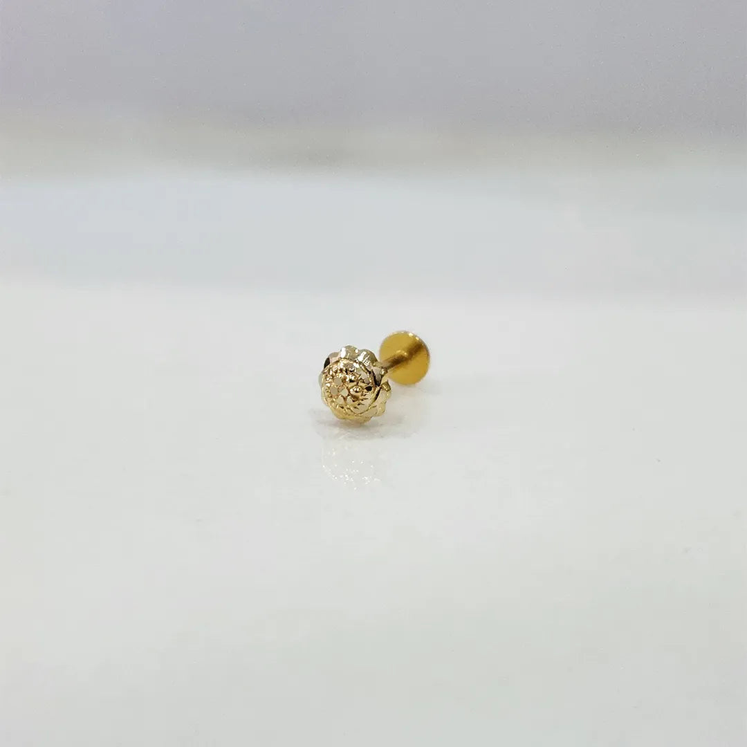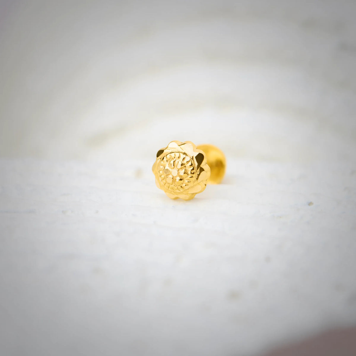 The nose pin in gold has a highly crafted floral centerpiece with multi-layered petal edges that exude royal elegance and classic beauty.