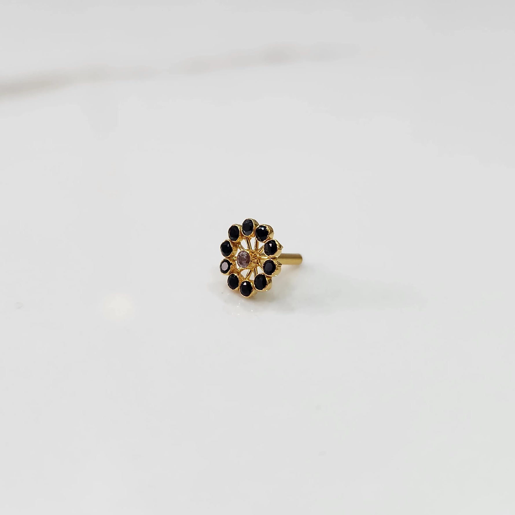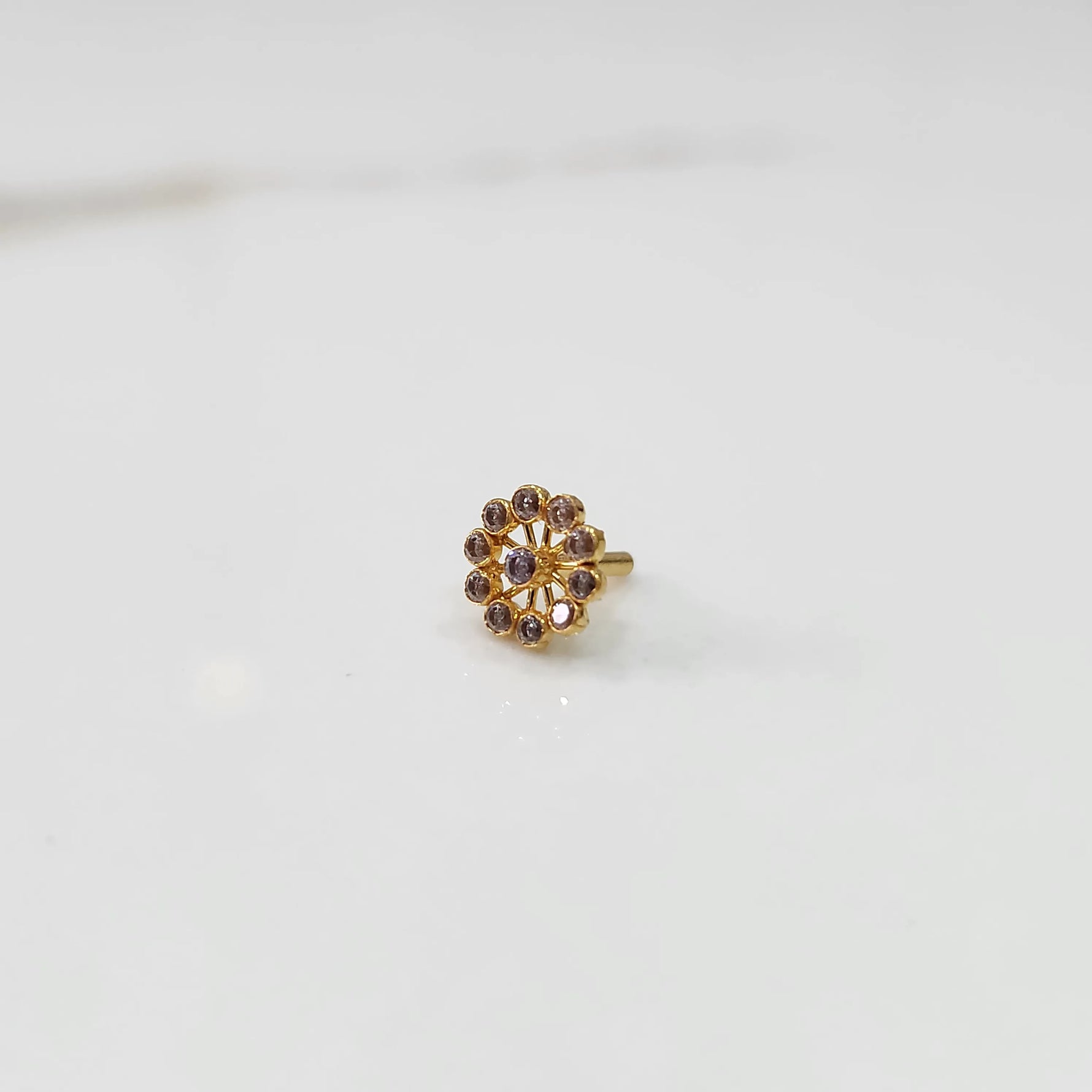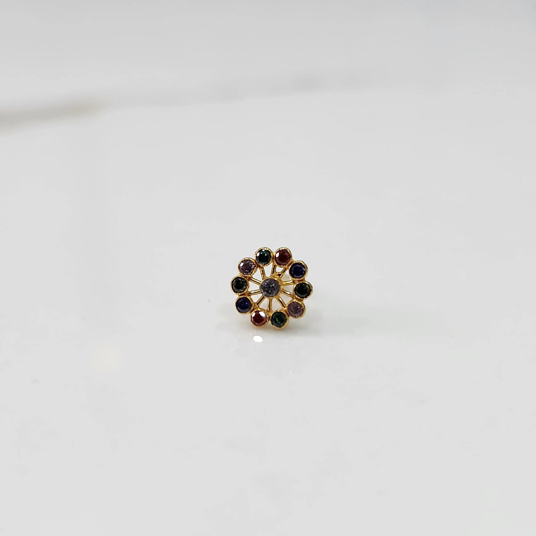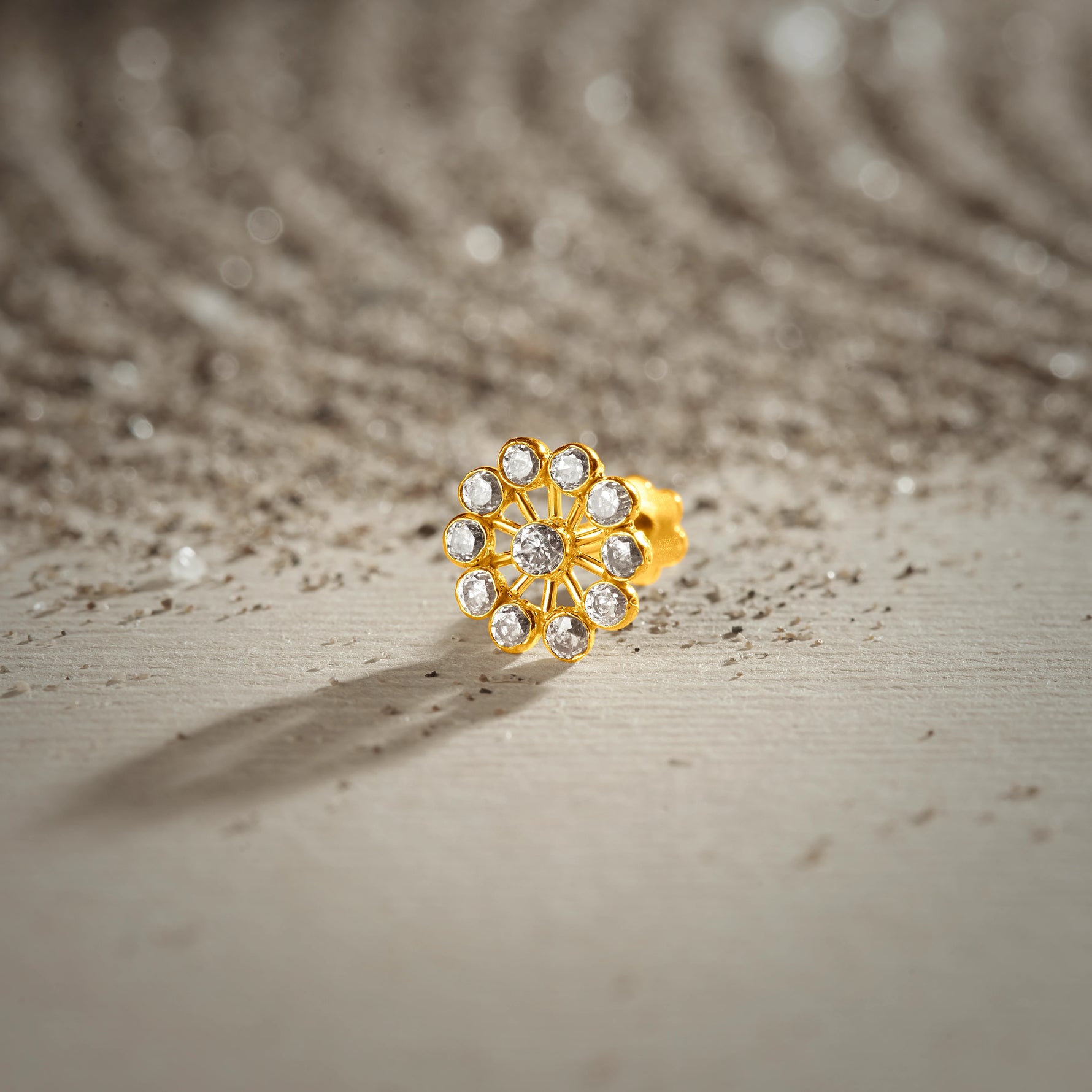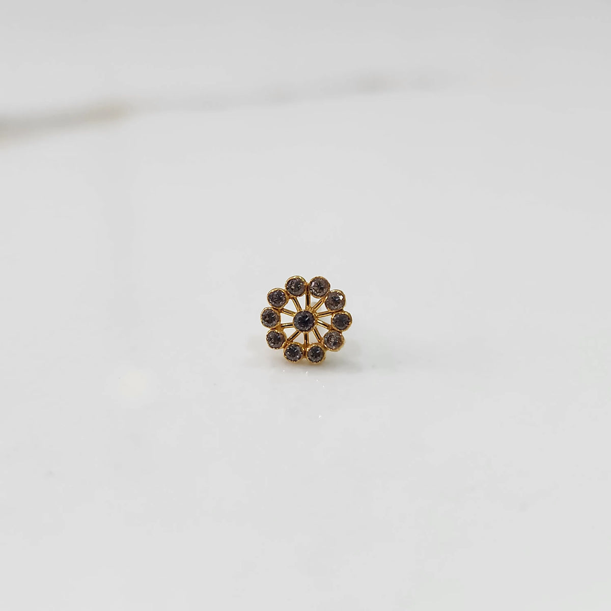 Design: Wheel-inspired stone gold nose pin with central sparkle