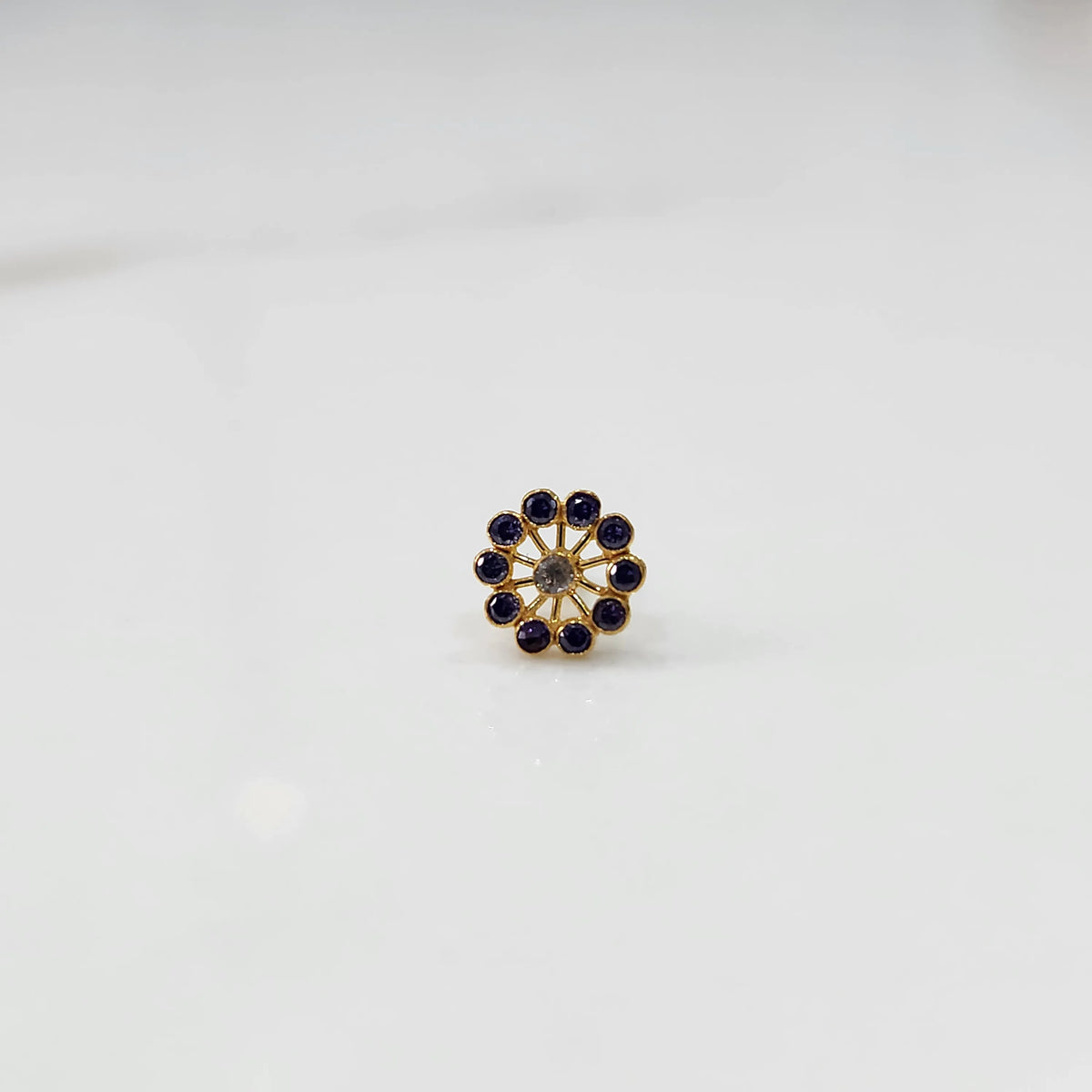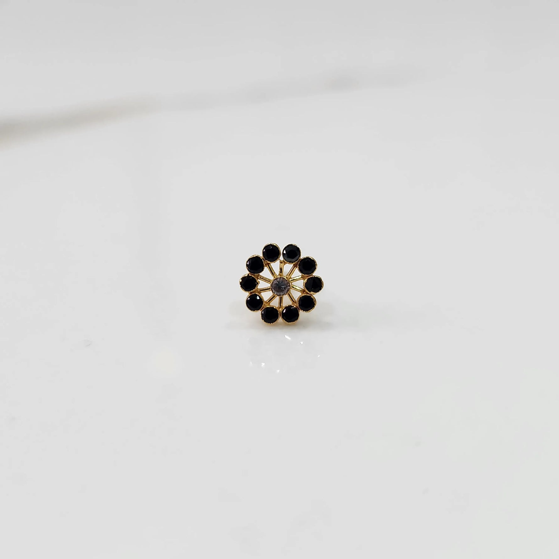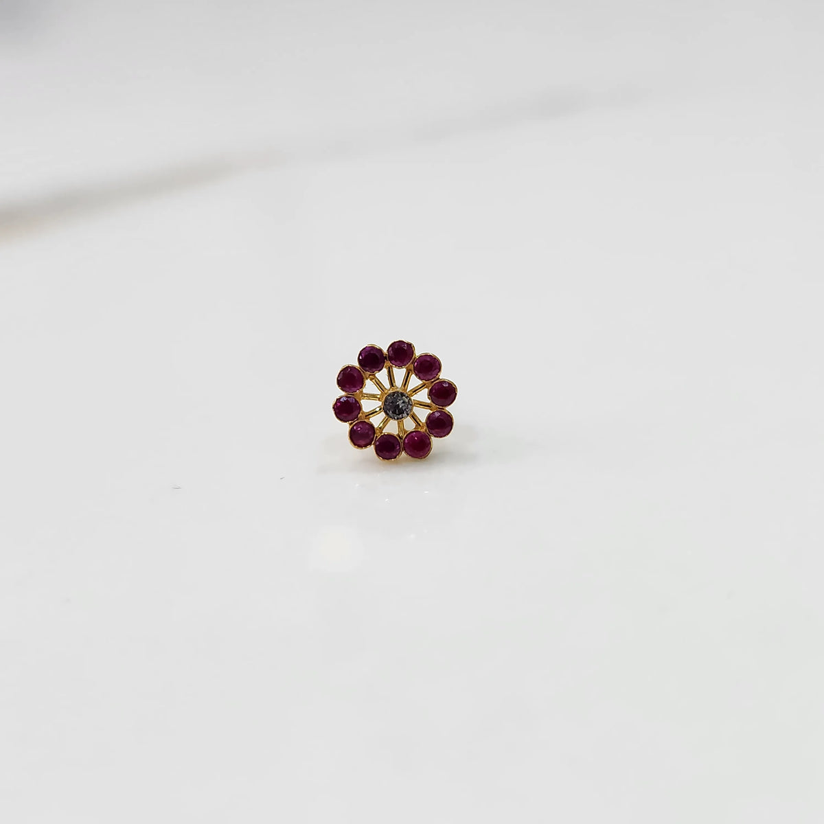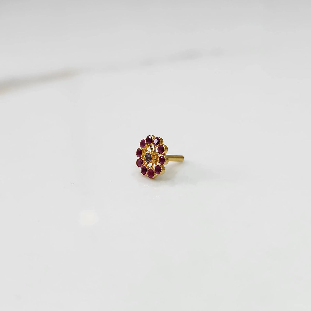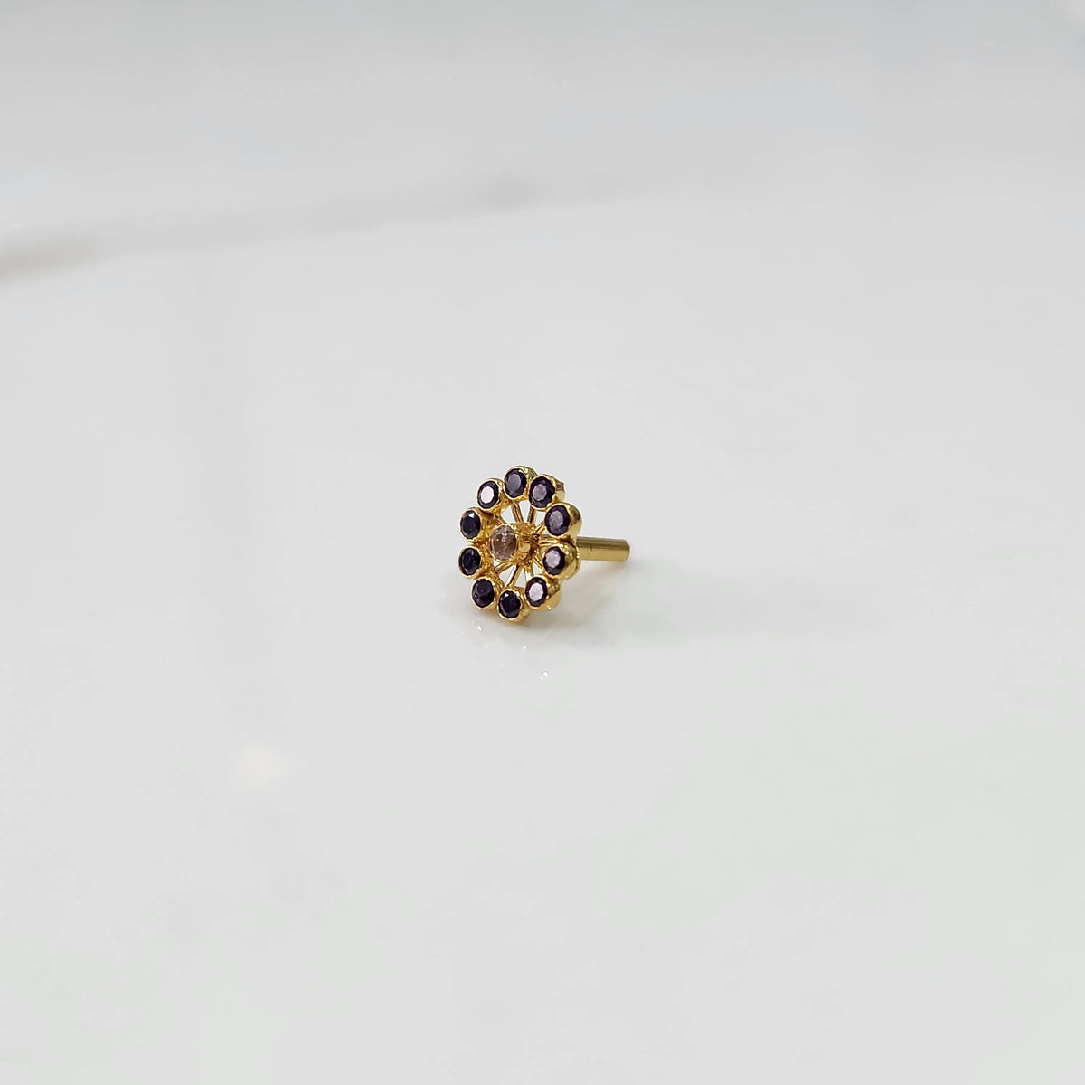 Design: Wheel-inspired stone gold nose pin with central sparkle