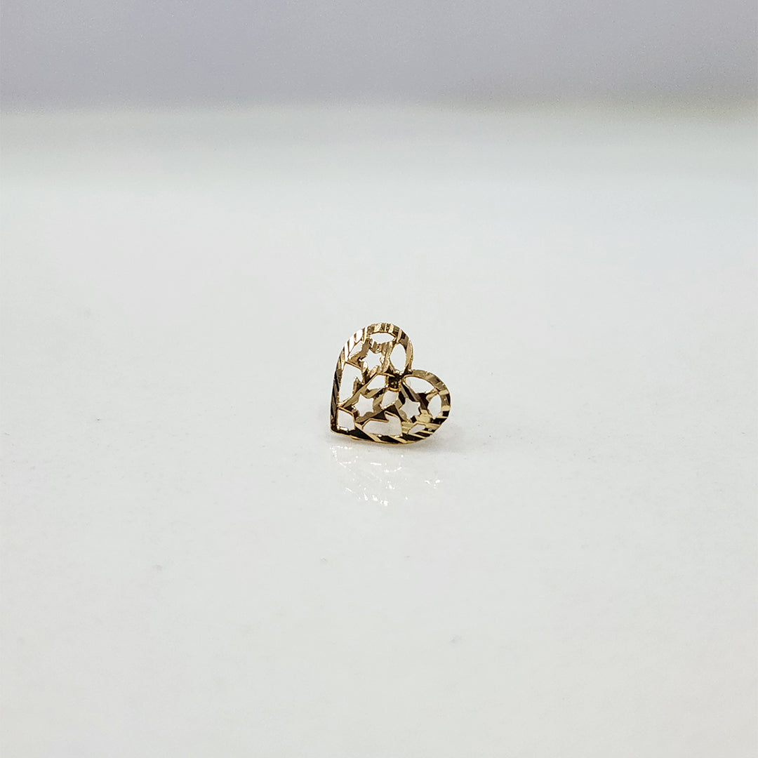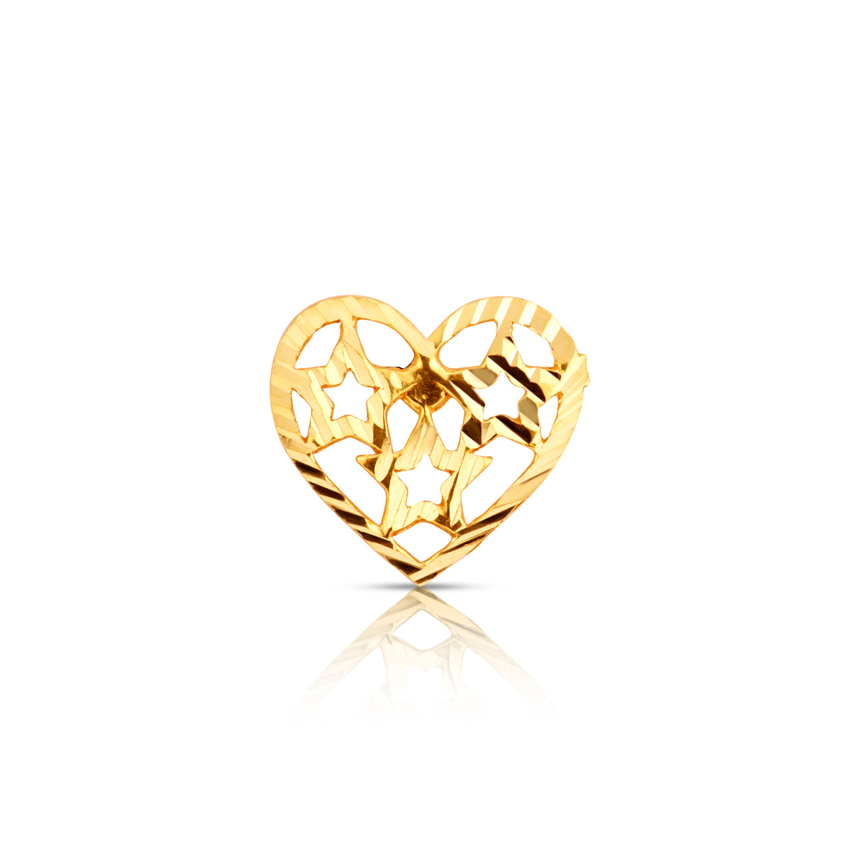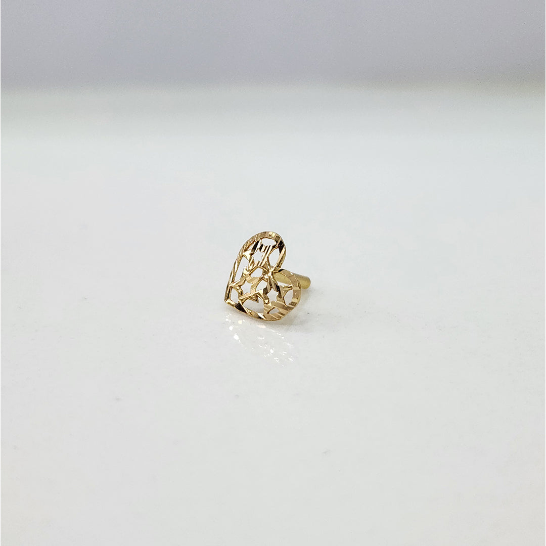 This brilliant gold nose pin has a bold openwork heart--lovely in its carving and studded with the cut-out stars and geometrical figures that glitter in every movement. Its polished texture finish makes it even more brilliant, so it has a slight shimmer even under weaker light. The heart silhouette is a perfect combination of tradition and modern style, so it is a daily luxury. You can buy this masterpiece with ease on the online store of Yuvora.