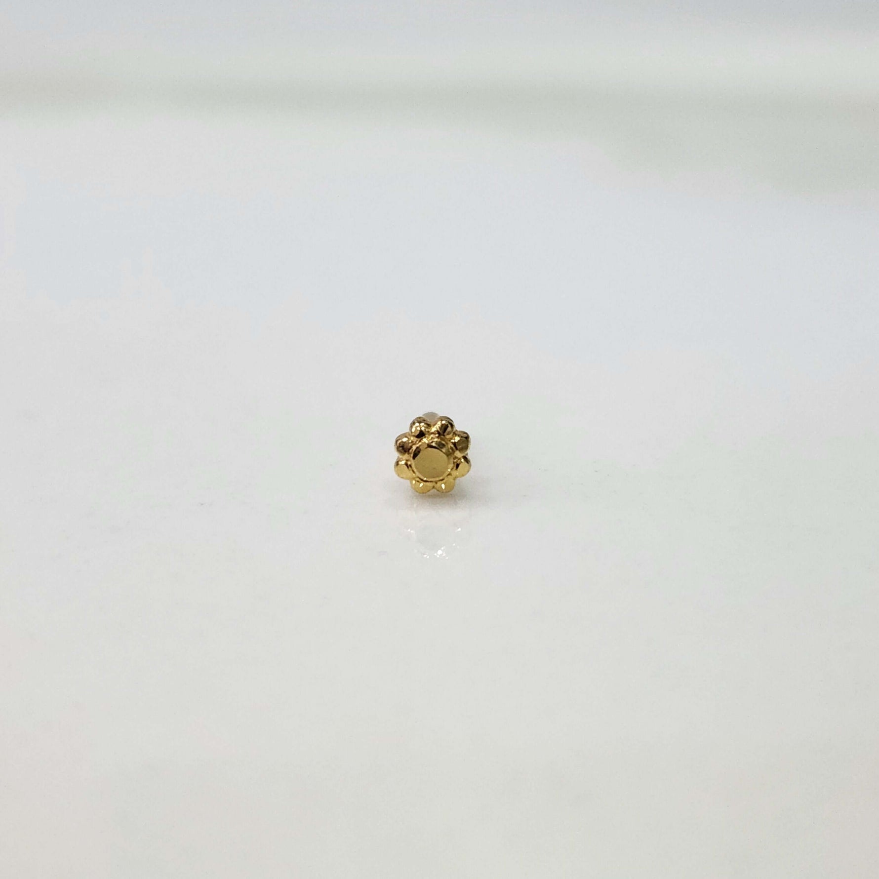 This gold nose pin features a well balanced floral pattern, with a smooth polished center and beads of rounded petal like beads. The pattern is joyful and sunny yet sophisticated and elegant, which is why it is suitable both in everyday life and on special occasions.