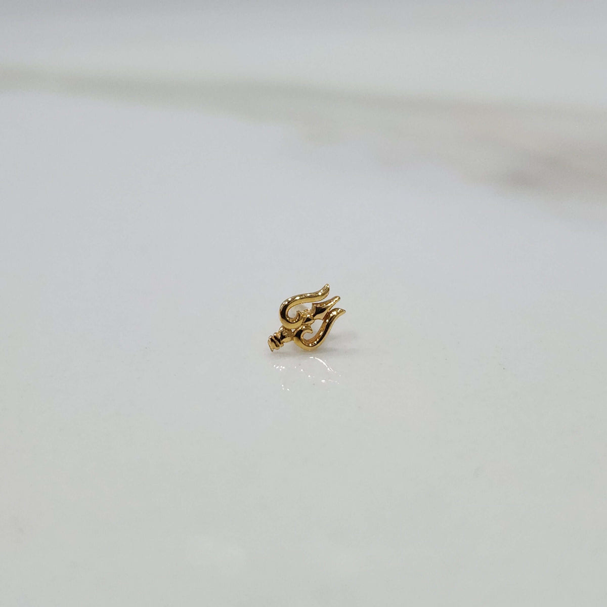 This small nose pin in gold features three smoothly curved prongs and a detailed base, capturing the true spirit of the traditional Trishul with a smooth, shiny finish.
