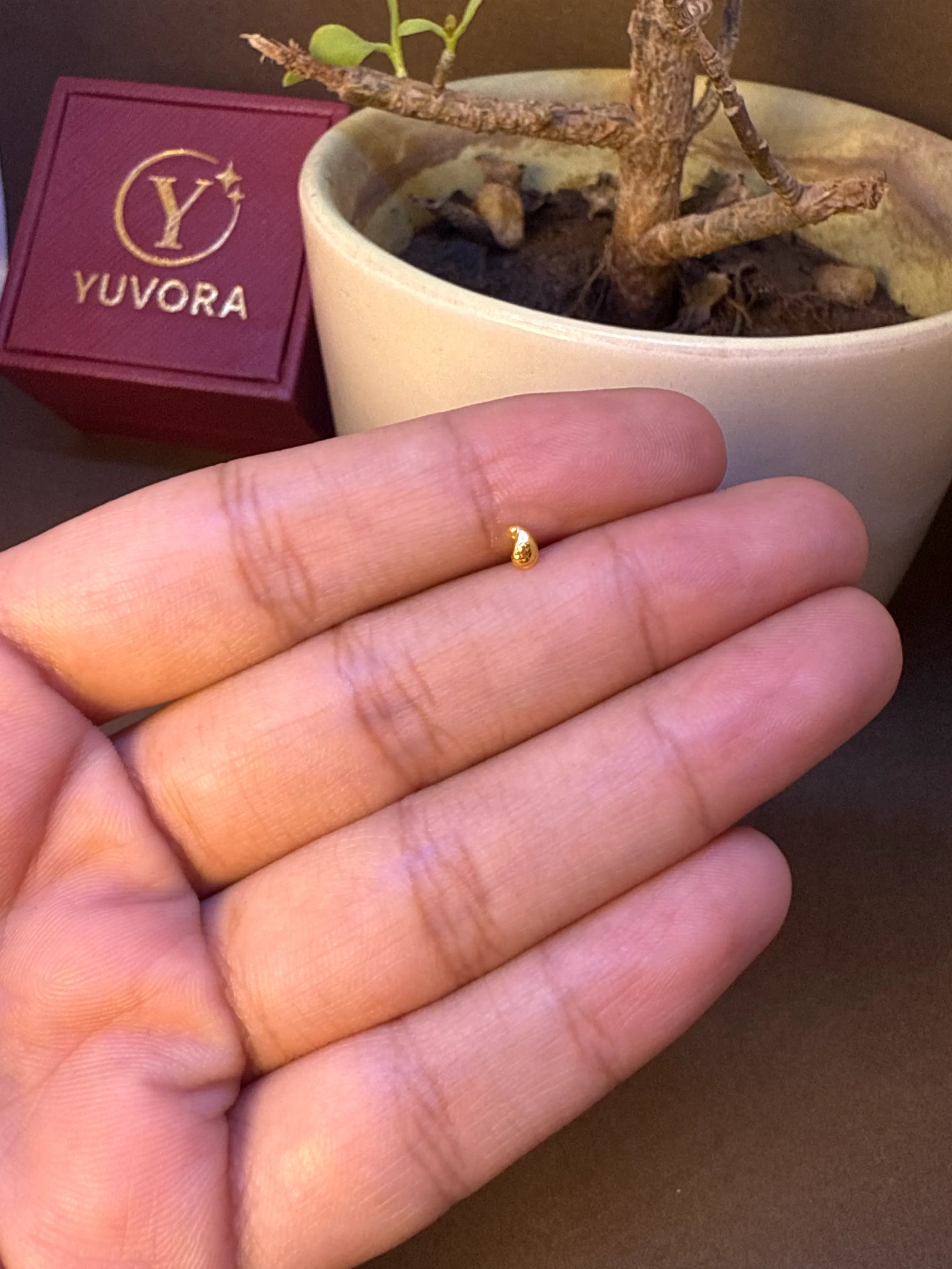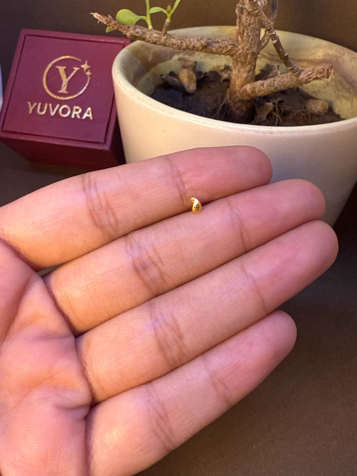 Celebrate timeless artistry with the Paisley Drop Gold Nose Pin, a beautifully crafted design inspired by the elegance of traditional paisley forms. Made in 18K hallmarked gold, this refined plain gold nose pin features a delicate paisley-inspired drop silhouette that adds gentle movement, soft curves and a warm golden glow to your everyday style.