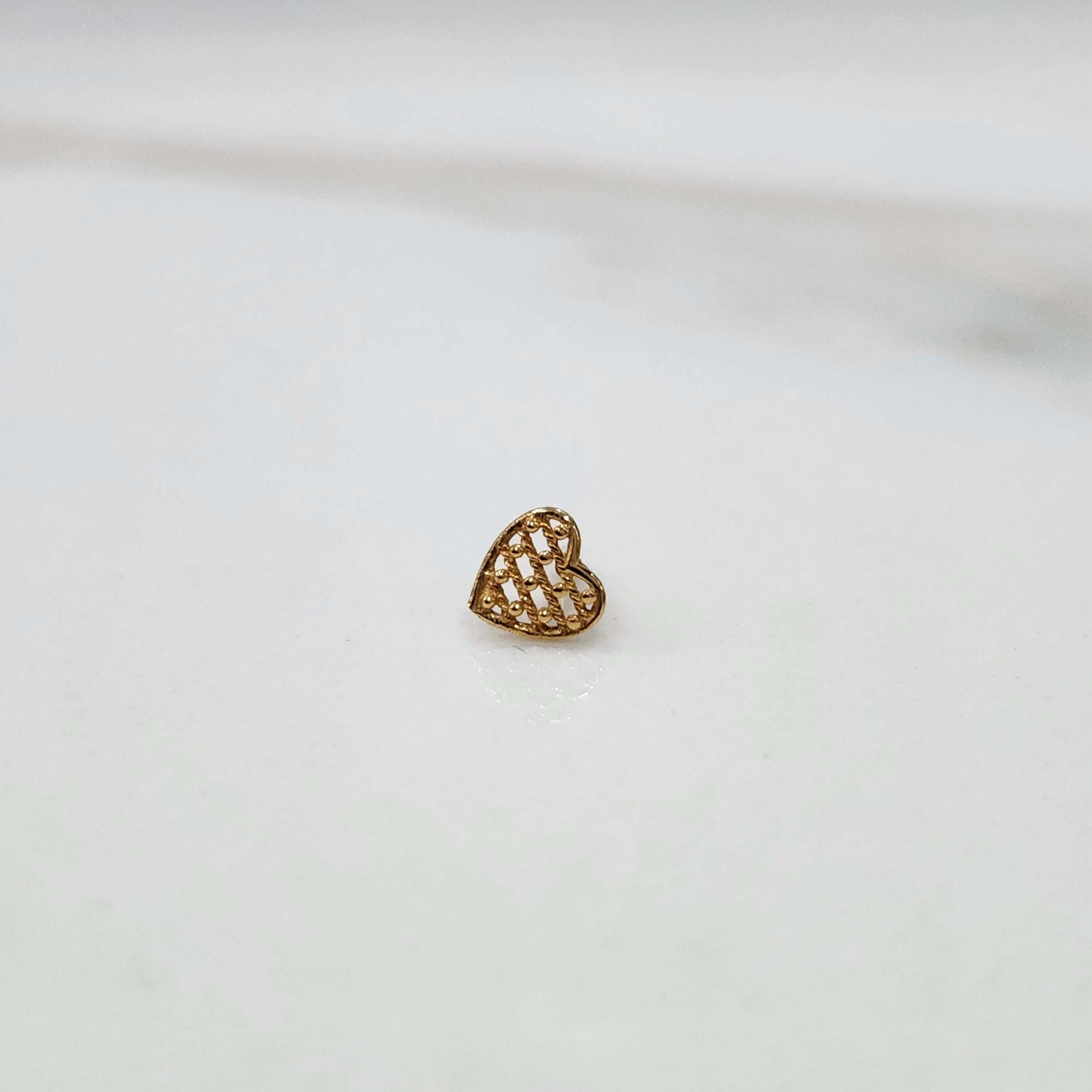 This gold nose pin is in the shape of a sculpted heart silhouette made in openwork lattice. The strands of gold are swirled and polished bead accents create an airy, delicate pattern that makes the piece light and dimensional. The open filigree is permeable to light, which gives it a certain sparkle with each movement.